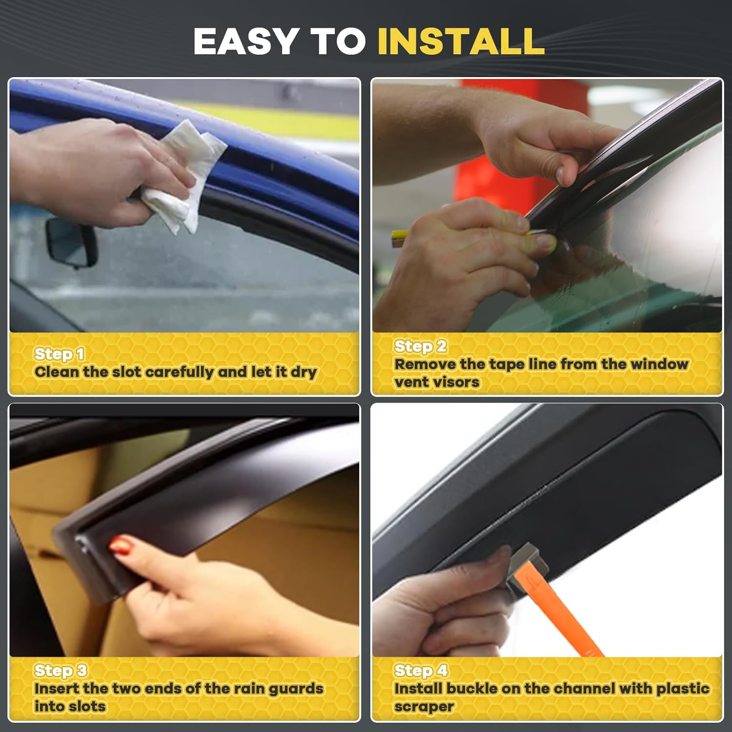 - 【Note】 Please watch the install video carefully before installing the window deflectors. Please avoid washing your car within 48 hours after installation. If there is any question about the vent shades, please feel free to contact us. We will reply to you in 24hr