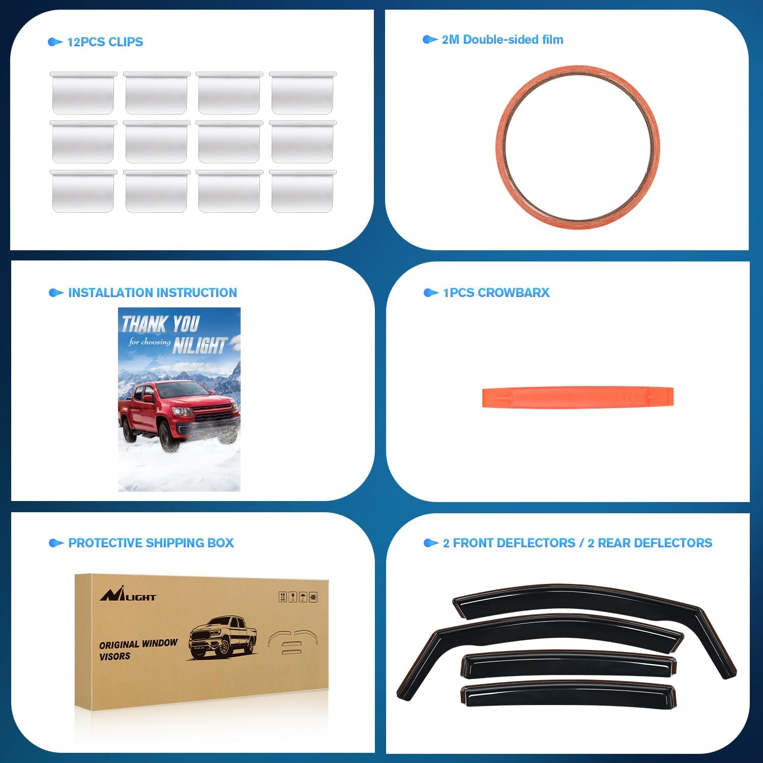 - PACKAGE INCLUDED:4 PCS Rain Guards,12pcs clips,Crowbar 1pcs,78inch double-sided tape and installation instruction