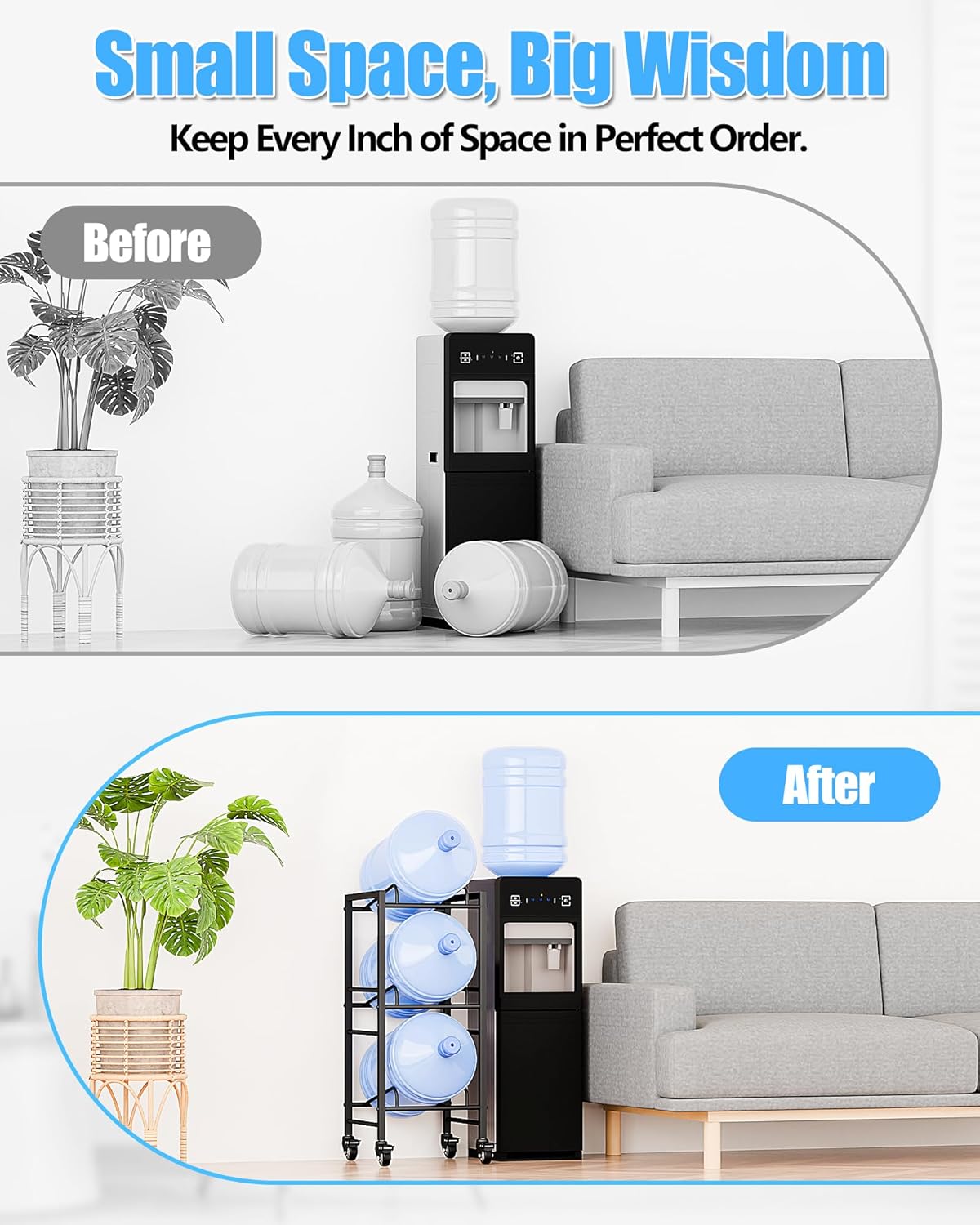 5 Gallon Water Jug Holder, Movable 3 Tier Heavy Duty Water Rack with 4 Wheels, Rack for Water Jug Storage, Space Saving Water Stand for Three 5 Gallon Water Jugs, Black