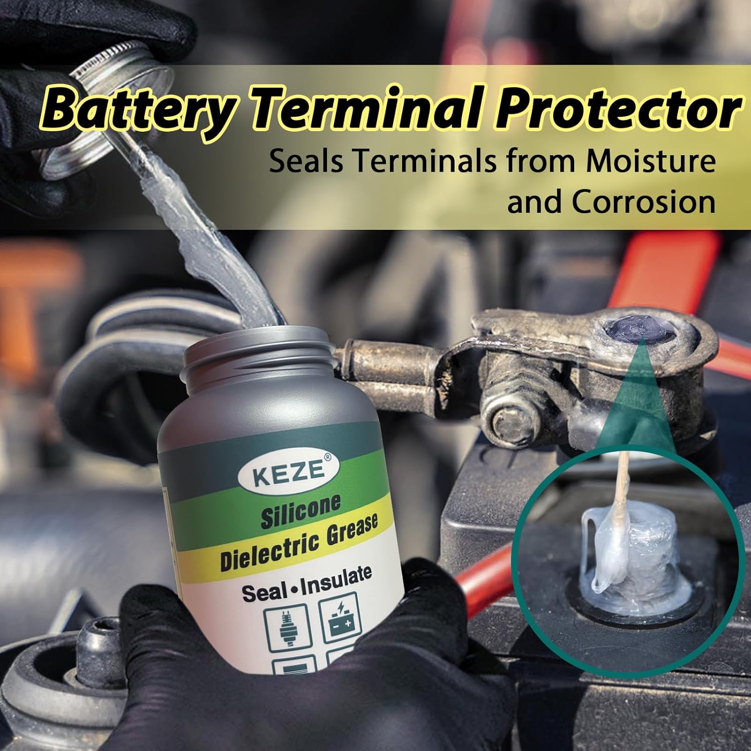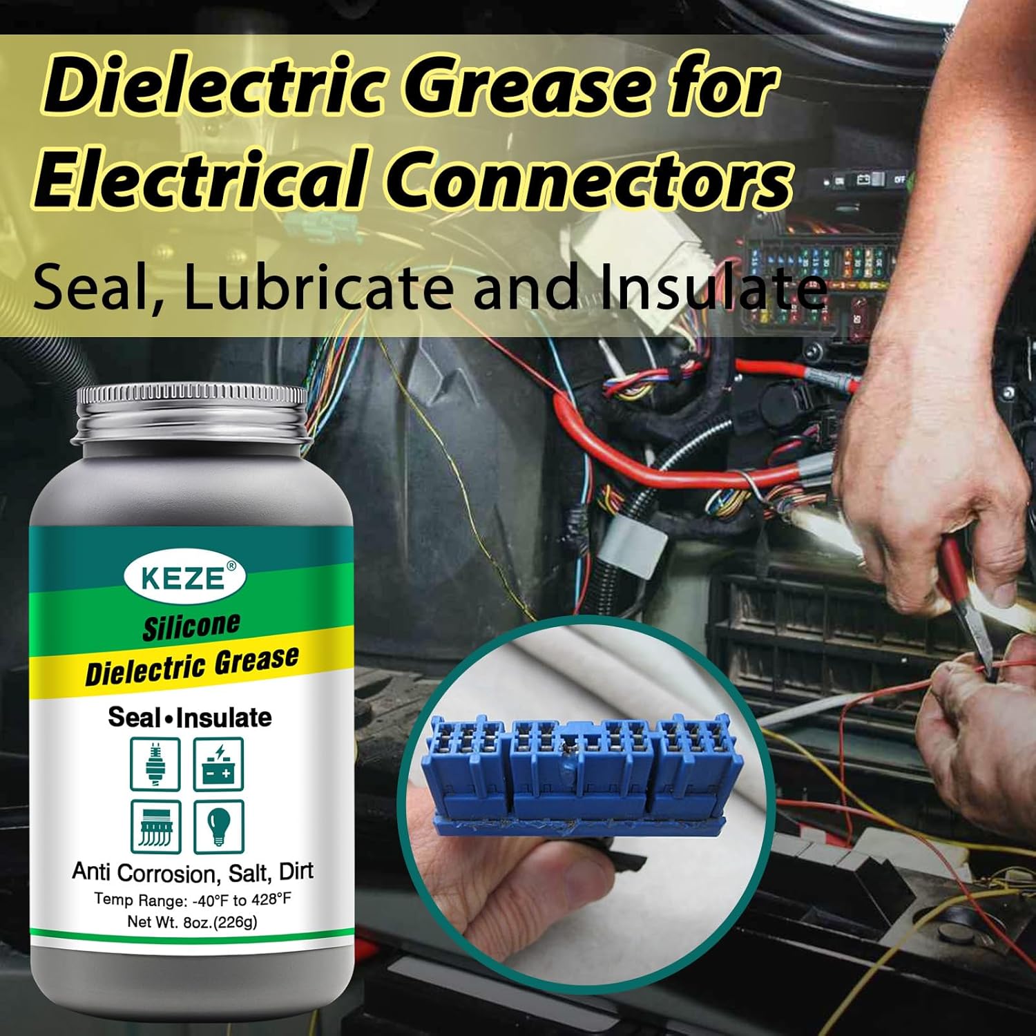 Keze Silicone Dielectric Grease Automotive Die Electric Grease Spark Plug Light Bulb Sockets Battery Terminal Electrical Contact Paste for Marine Against Salt, Dirt Corrosion Brush Top Can, 8 Oz