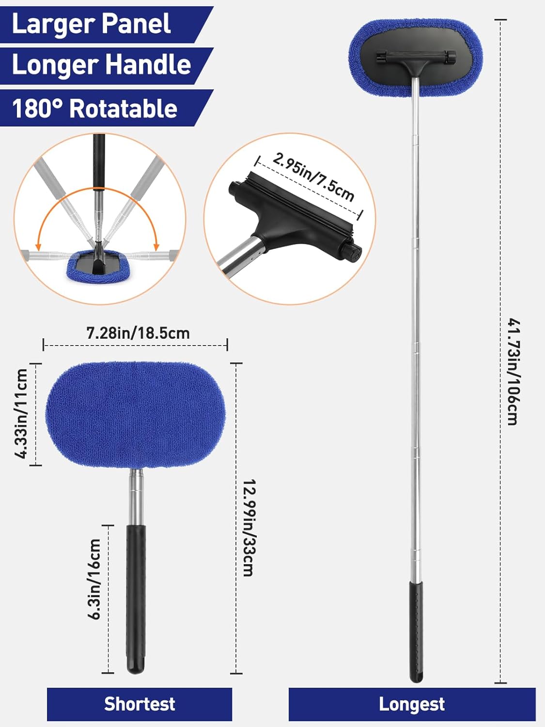 - 【40" Pole & 180° Rotatable】 Our inside car windshield tool pole can be extended from 11”to 40“(28.5cm to 101.5cm),longer than other glass brushes, so even when you are in the driver's seat, you can easily scrape the water and fog off the rear-view mirror on the other side by car squeegee. with a 180° swivel head, easily to clean hard-to-reach car window bases. Enjoy Car wash time and free your back!