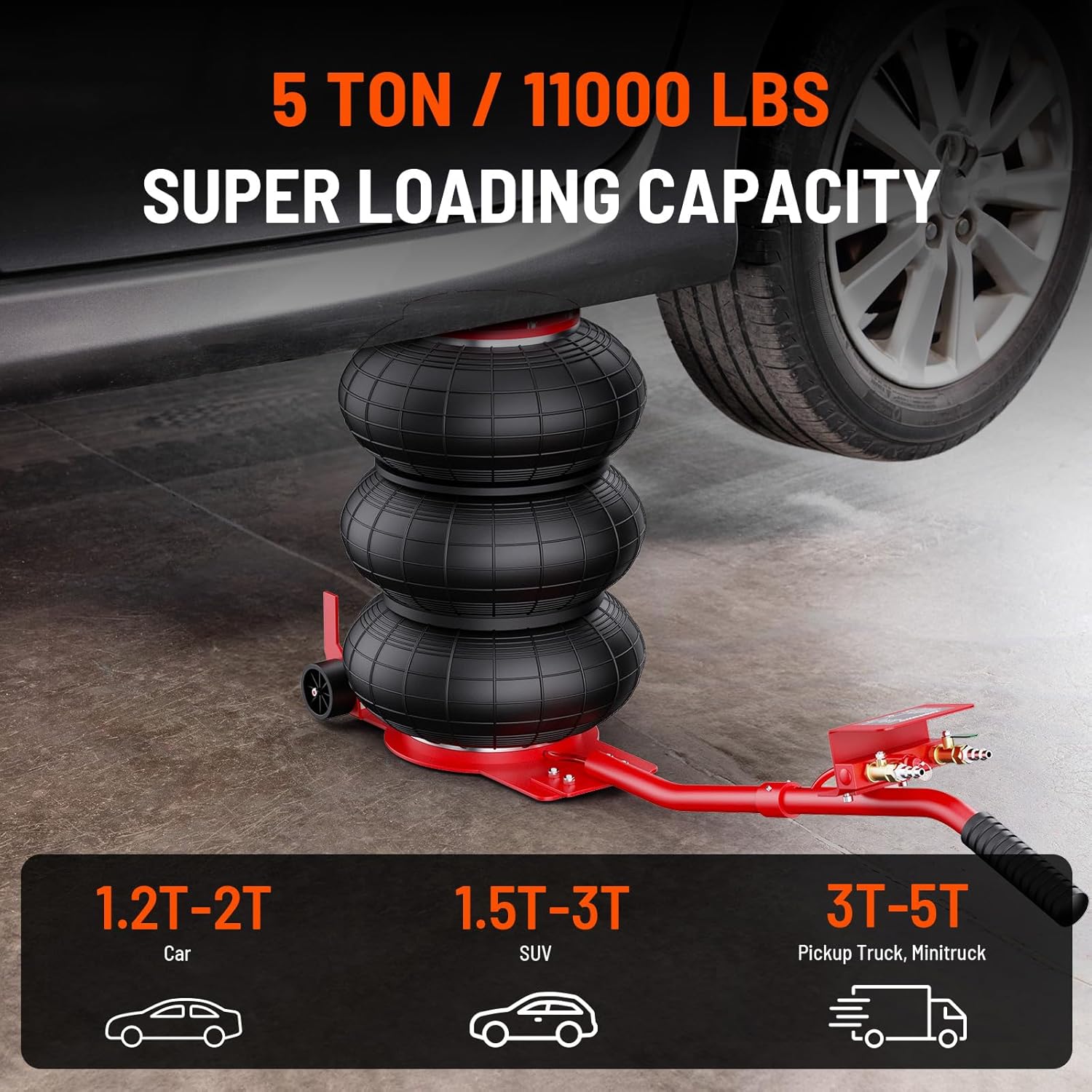 - 11000 lbs Load Capacity: This powerful 5 Ton (11000 lbs) air jack effortlessly handles a wide range of vehicles, from family cars and pickups to SUVs. Perfect for both home and commercial use, it’s your go-to tool for heavy-duty lifting.