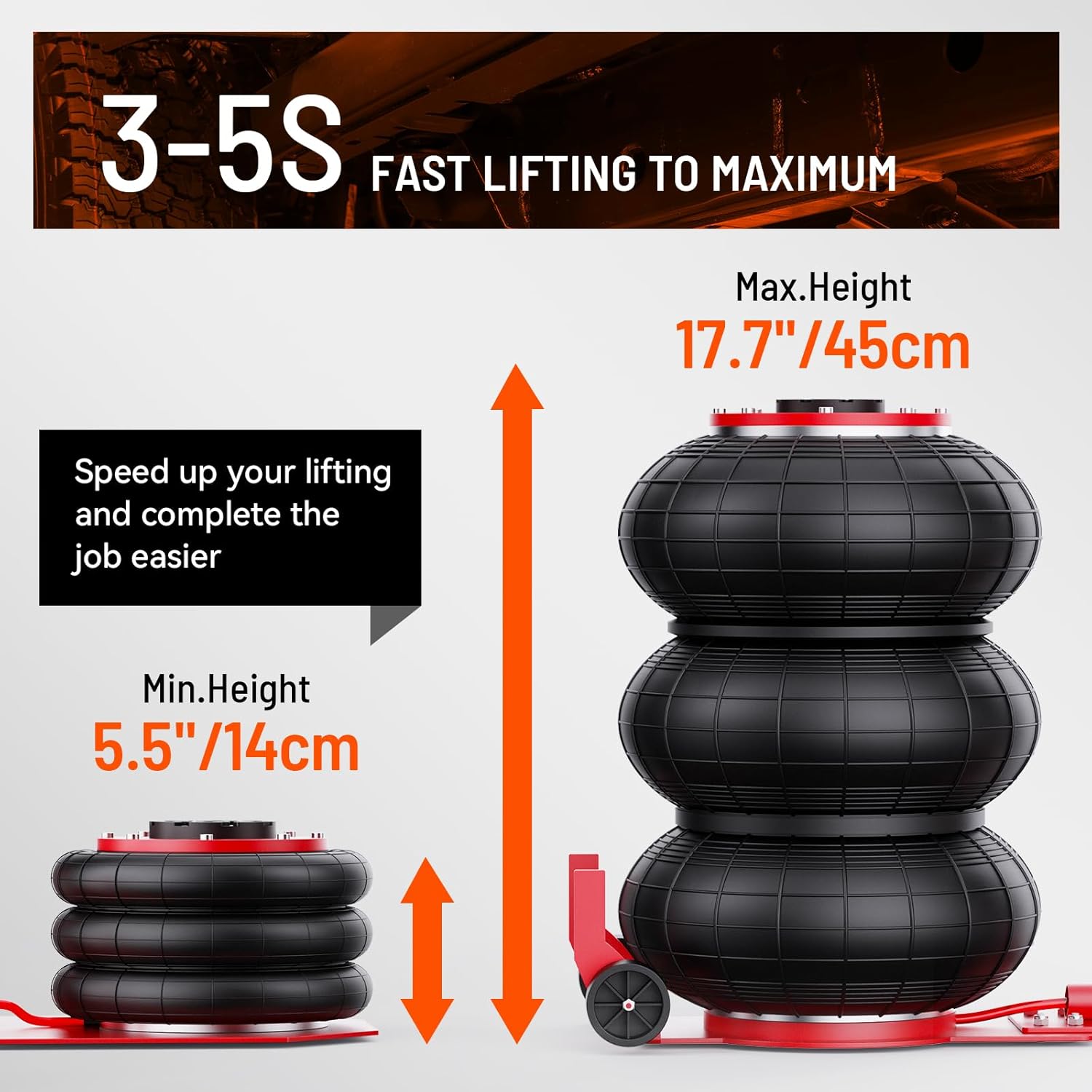 - Wide Lifting Range: Effortlessly lift vehicles of various sizes with our pneumatic jack's impressive range of 5.5–17.7 inches (140 mm–450 mm). Whether you're working on low-profile cars or taller SUVs, this car jack provides the flexibility you need for smooth, efficient repairs.