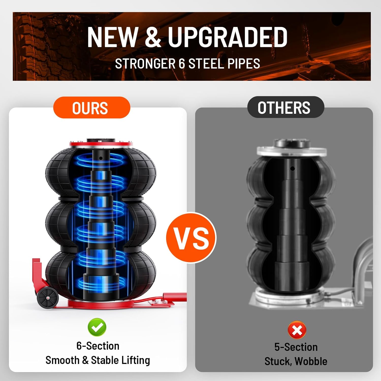 - Upgraded Stability Design: The air jack features six reinforced steel pipes, optimized for height and structure. This design ensures exceptional stability when lifting heavy vehicles.