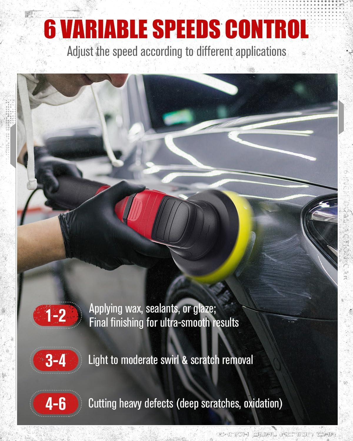 AVID POWER Dual Action Car Buffer Polisher, 6 Inch Orbital Polisher for Car Detailing with 6 Variable Speeds, Detachable Handle & 3 Polishing Pads