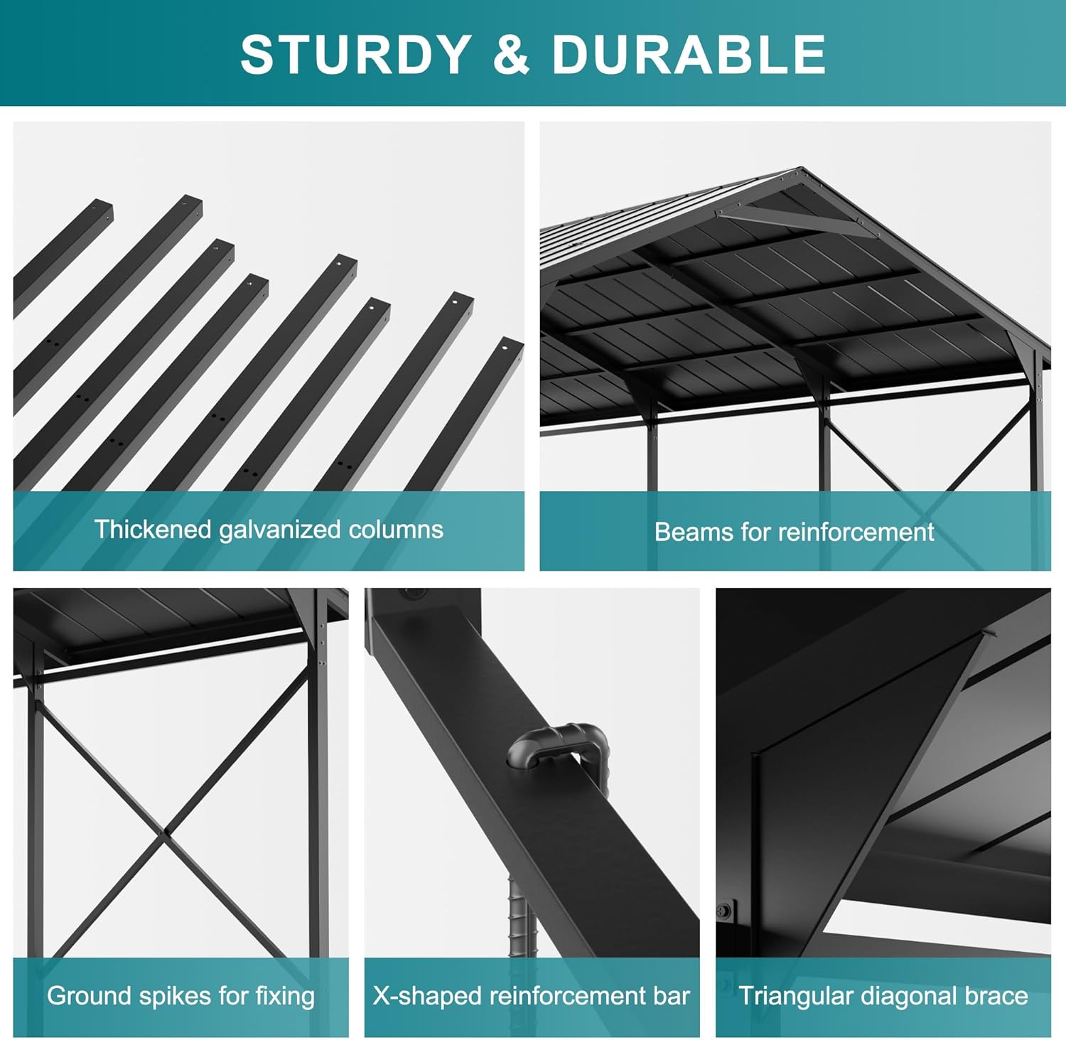 - Safety: The carport is super reinforced,with a total of 9 crossbar beams at the top, triangular reinforcement at the corners of the carport, the top can carry 10cm thick snow. There are four sets of X-shaped reinforcement bars on the side of the carport. Carport accessories are fully wrapped to reduce the risk of cuts. Reinforced ground spikes at the bottom for added stability, the carport can be used on multiple surfaces such as asphalt, concrete, gravel, grass and more