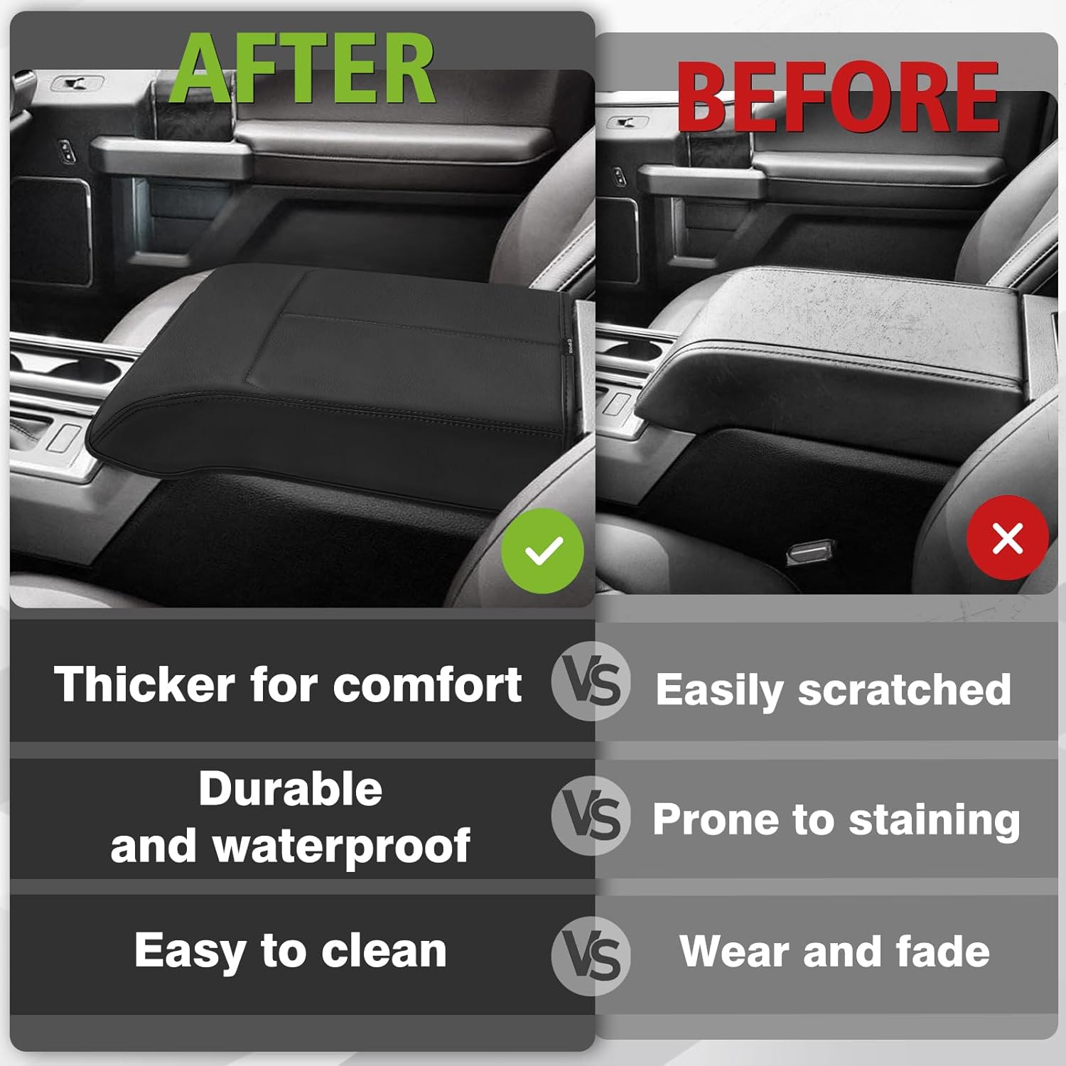 - Unique Design: Designed according to the OEM element to make it match your vehicle perfectly and even better. Our armrest cover is crafted with high-quality Vegan Leather and an extra layer of foam, which is skin-friendly, breathable and soft.