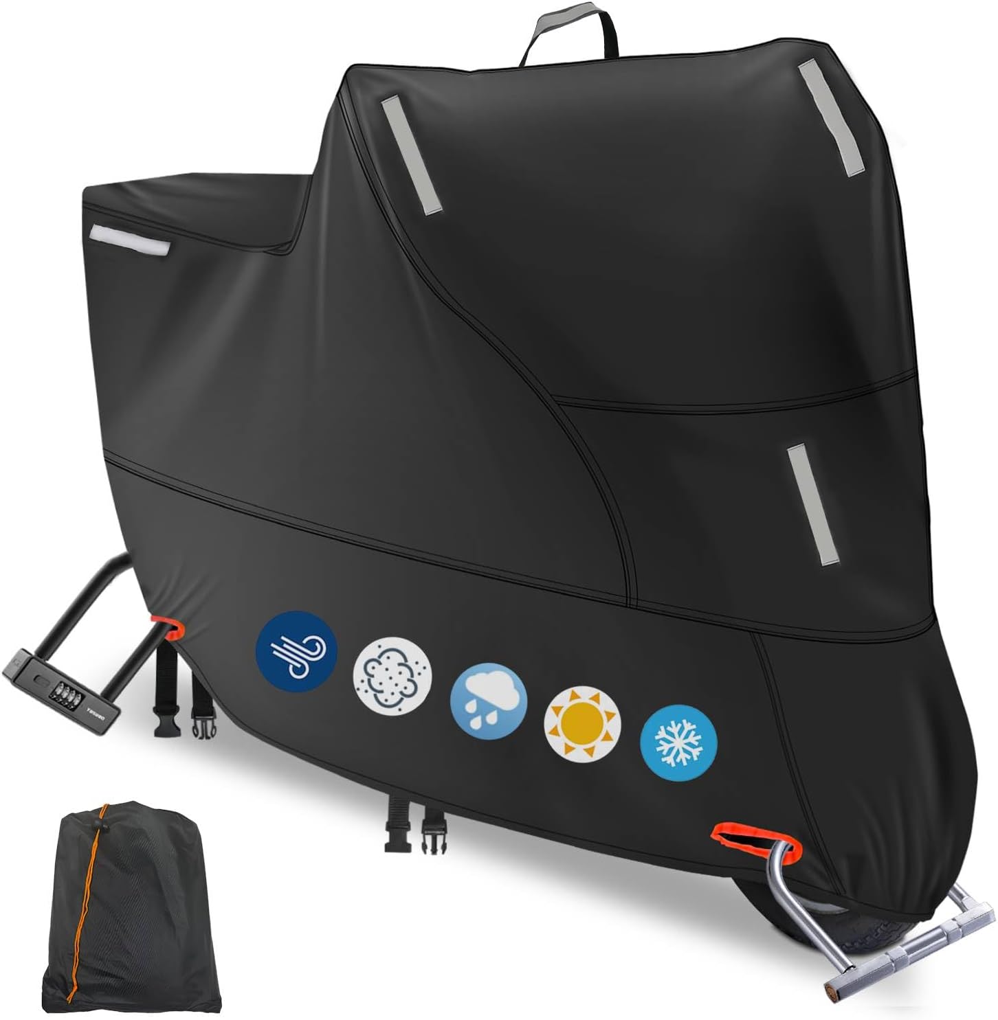 - Functional Details: ① 4 Reflective strips on the left and right sides of the front and back to improve safety at night; ② 1 reflective carrying handle for easy lifting and folding; ③ 2 fixed buckles at the bottom, and 1 of which is movable buckle and windproof; ④ 4 locking holes can be combined with motorbike lock to secure the front and back; ⑤ 300D oxford outer and silver coated lining for sun protection and waterproof.