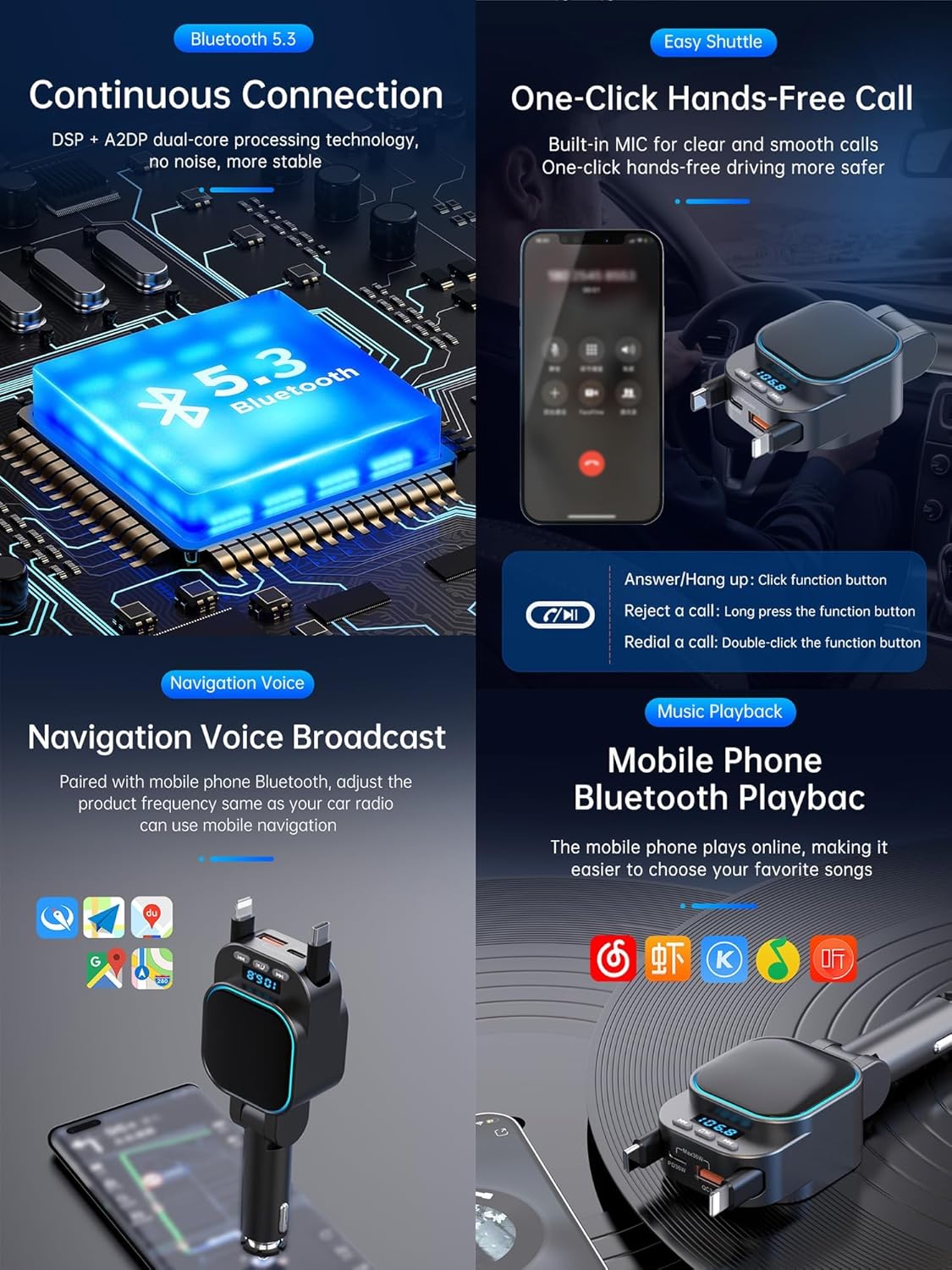 - Ⅰ: The Ultimate Multi Device Charging Car Organization : Car Charger USB C with Bluetooth Car Adapter- The 4 in 1 Retractable Car Charger with dual USB ports and versatile cable provides complete charging solutions. Perfect as truck accessories for men or gifts for drivers, this USB C Car Charger ensures fast charging for iPhone 16 Pro Max and Android devices. Keep your Car Charger-powered vehicle clutter free with smart organization.