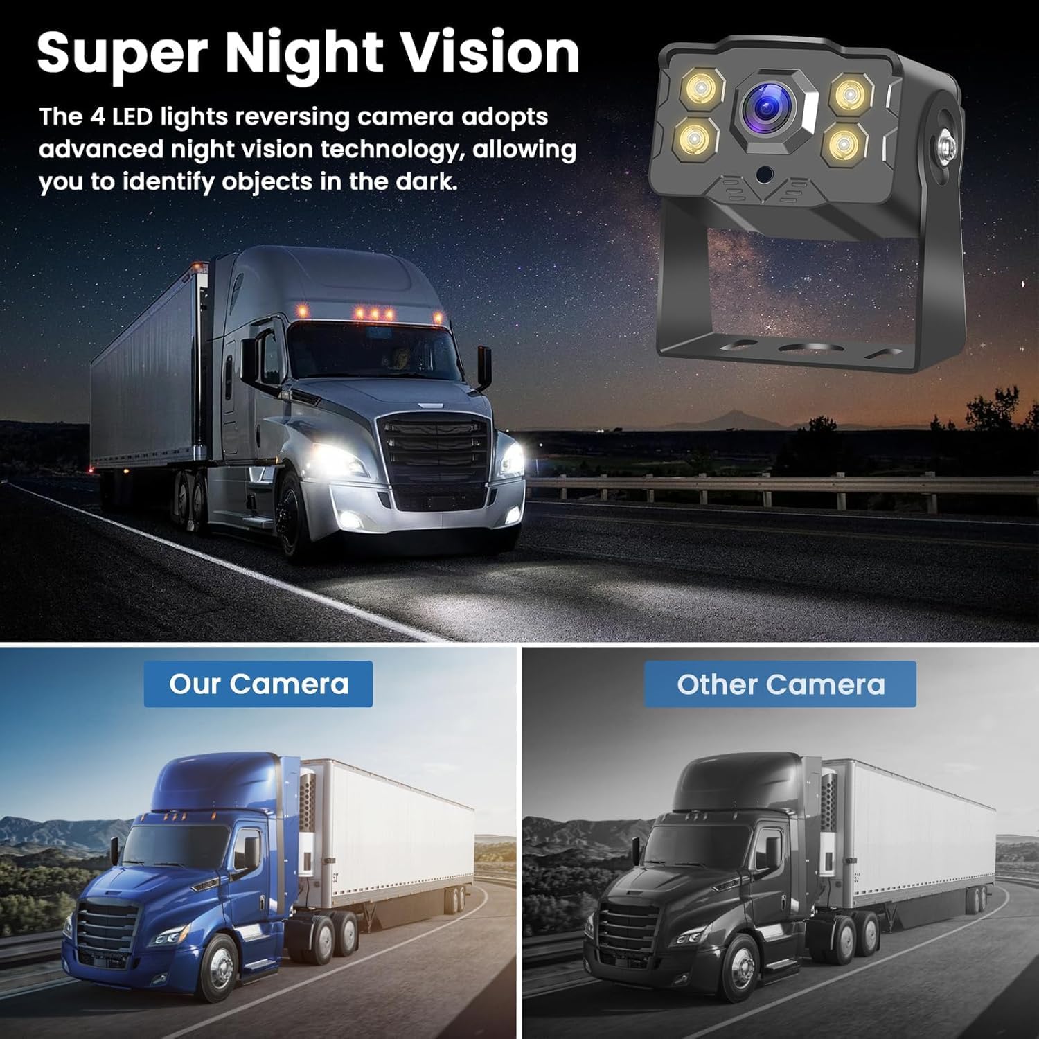 - Excellent Night Vision and Wide Angle: The backup camera features 4 LED lights and advanced night vision technology, enabling clear visibility even in low-light conditions. The wide-angle lens provides a comprehensive view