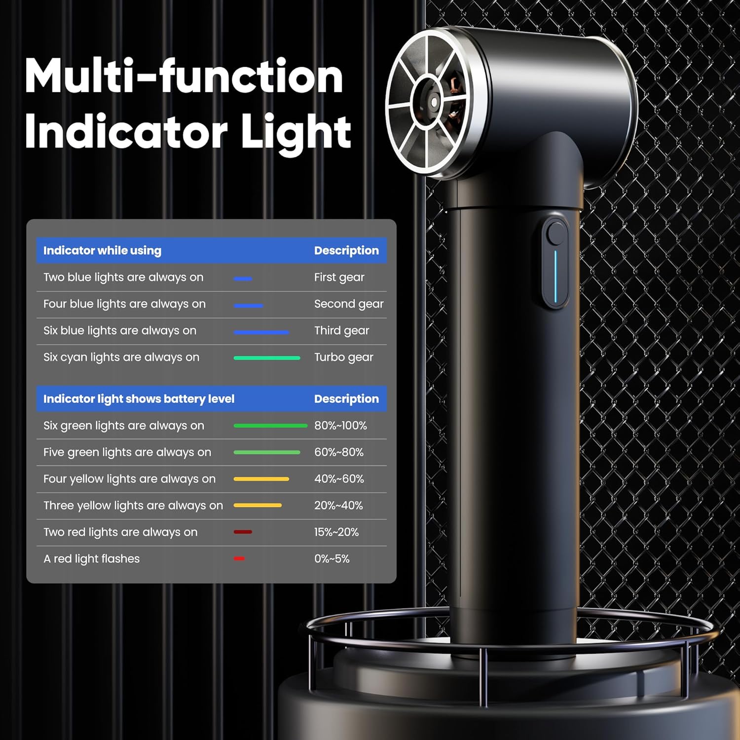 - Multifunctional Indicator Light: The car dryer air blower keeps you informed with a multifunctional LED indicator — showing key statuses: blue for the first three modes, cyan for turbo mode, green for full battery, yellow for half charge, and red when the battery is nearly depleted.