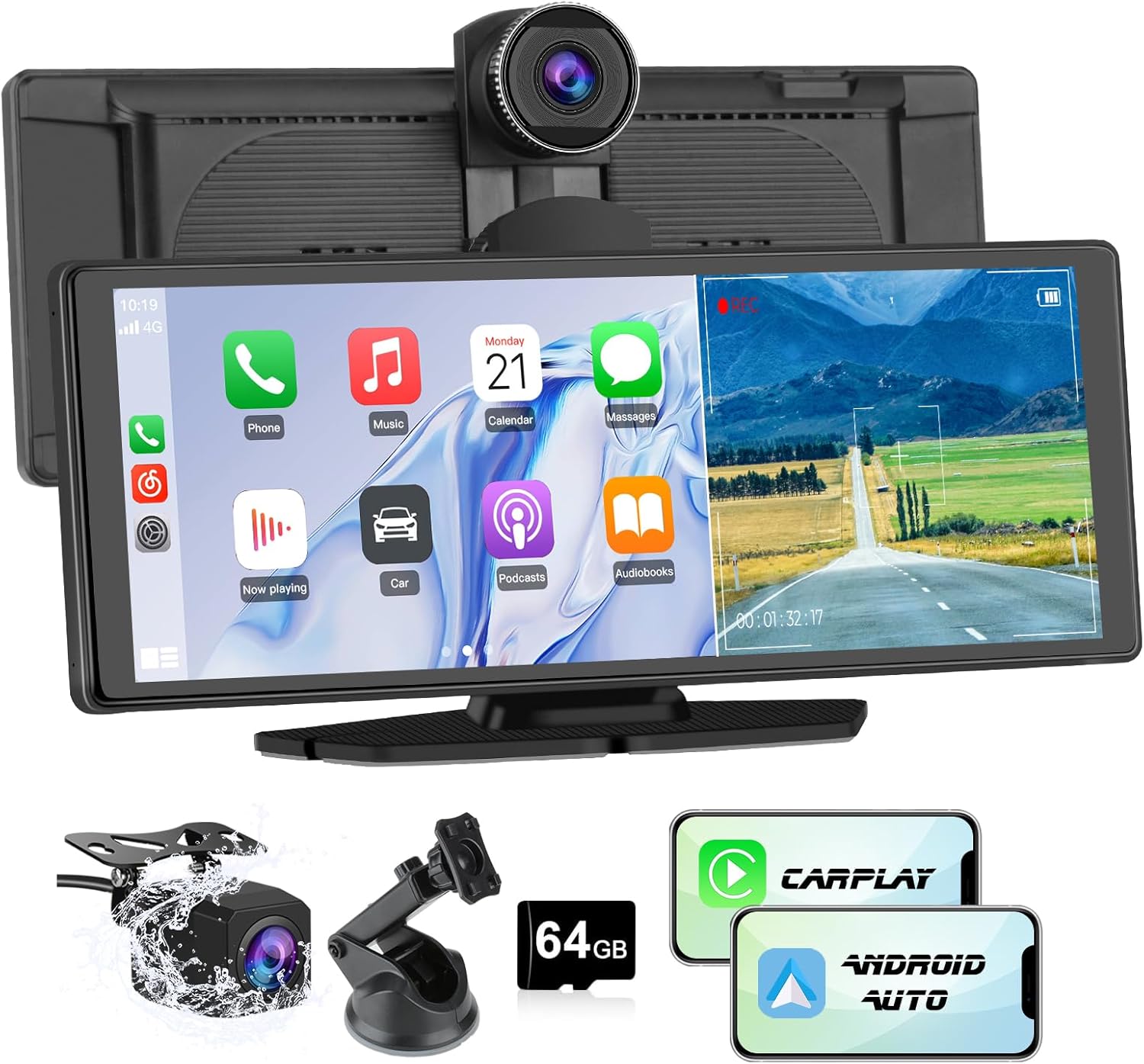 - 【Carplay screen for car with Dash Cam and Backup Camera】This CarPlay screen comes with a 4K Dash Cam for the front and a 1080p rear camera for complete driving coverage and safer parking. The package includes a 64GB memory card (required for Dash Cam functionality). The reversing camera cable is 6M long, and for vehicles over 6M, the camera may not function properly.