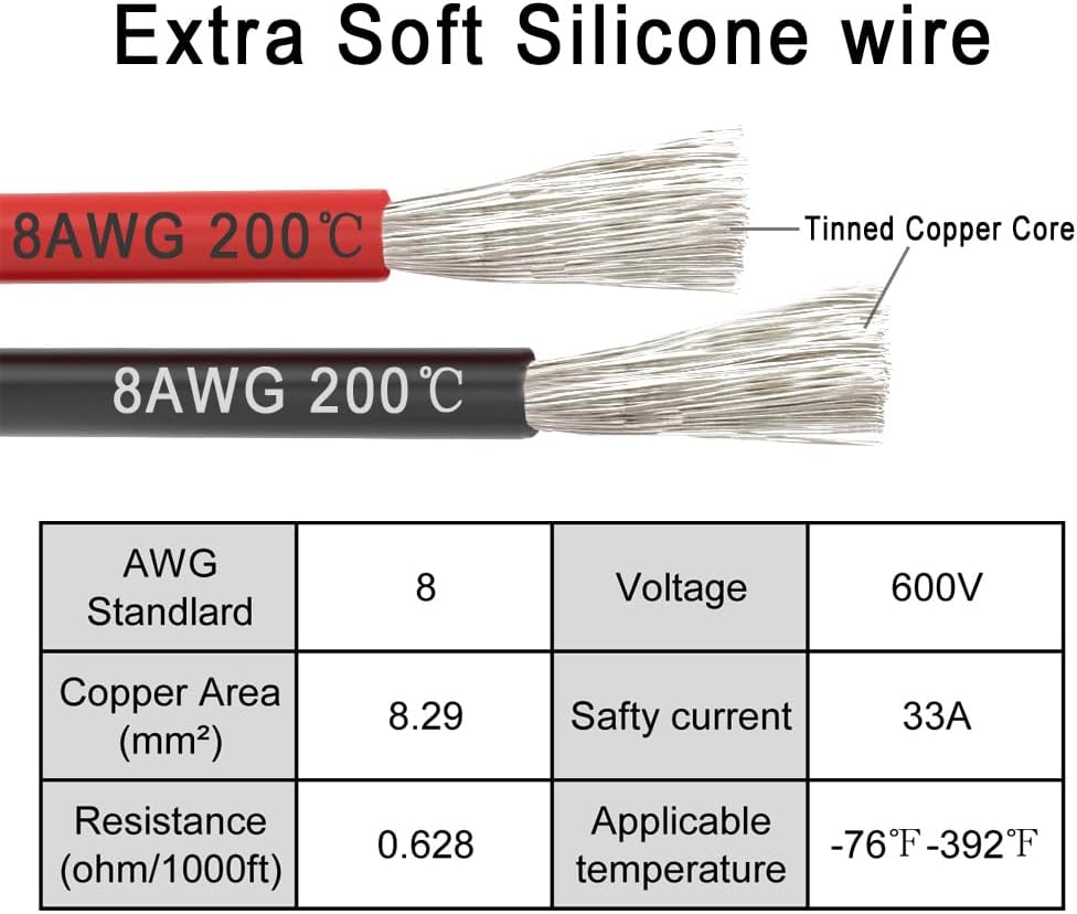 - [Product Detailed Specification]: Wire cable: 8AWG (Tinned copper ), Wire sheath: silica gel, Wire temperature resistance: 392℉ 200℃, Total length: 2FT. This product is designed with a voltage range of 12-24V. Very suitable for medium-sized cars, light pickups, light recreational vehicles, trucks, RVs, and off-road vehicles.