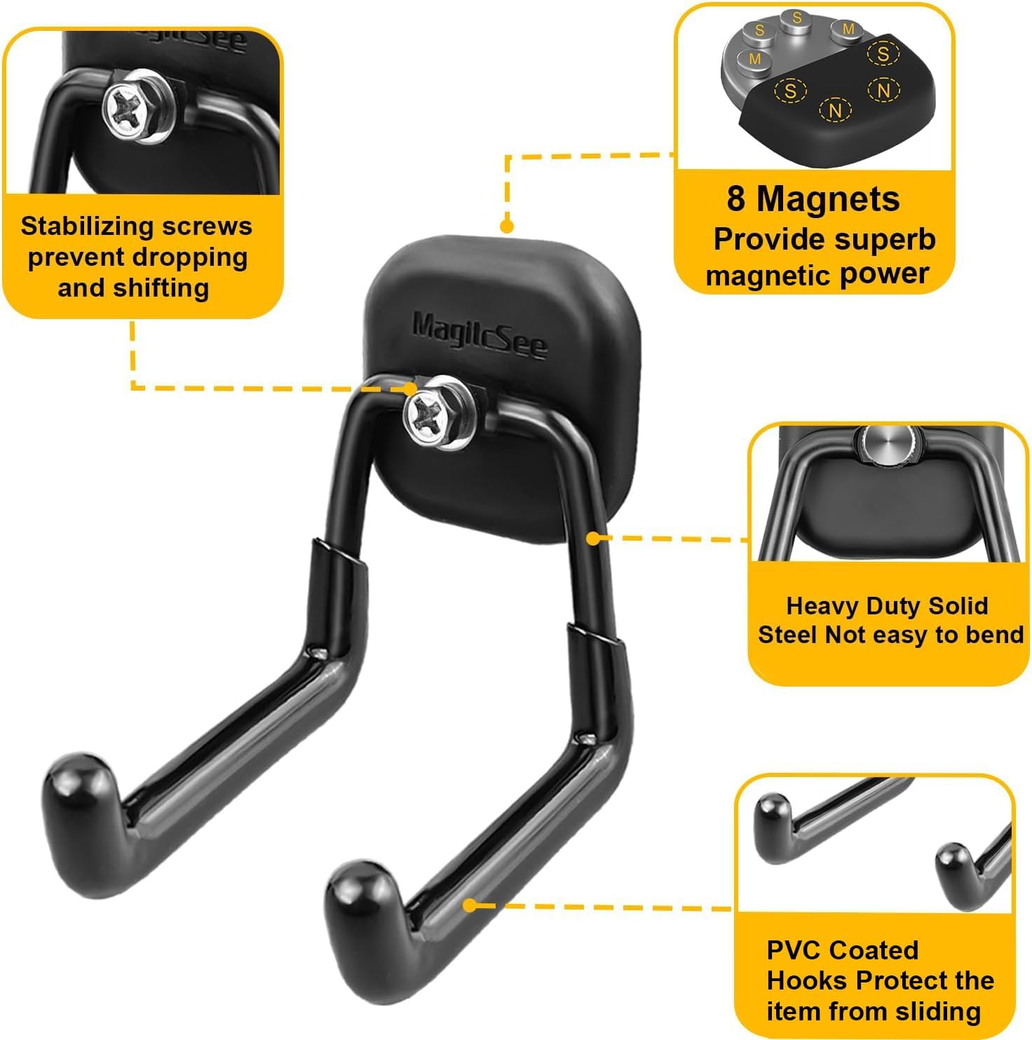 - Anti-Scratch: The rubber-coated magnetic base provides a soft and frictional surface while sticking firmly to metal surfaces.It won't scratch metal surfaces,and is water and rust resistant.The package includes two Magnetic hooks