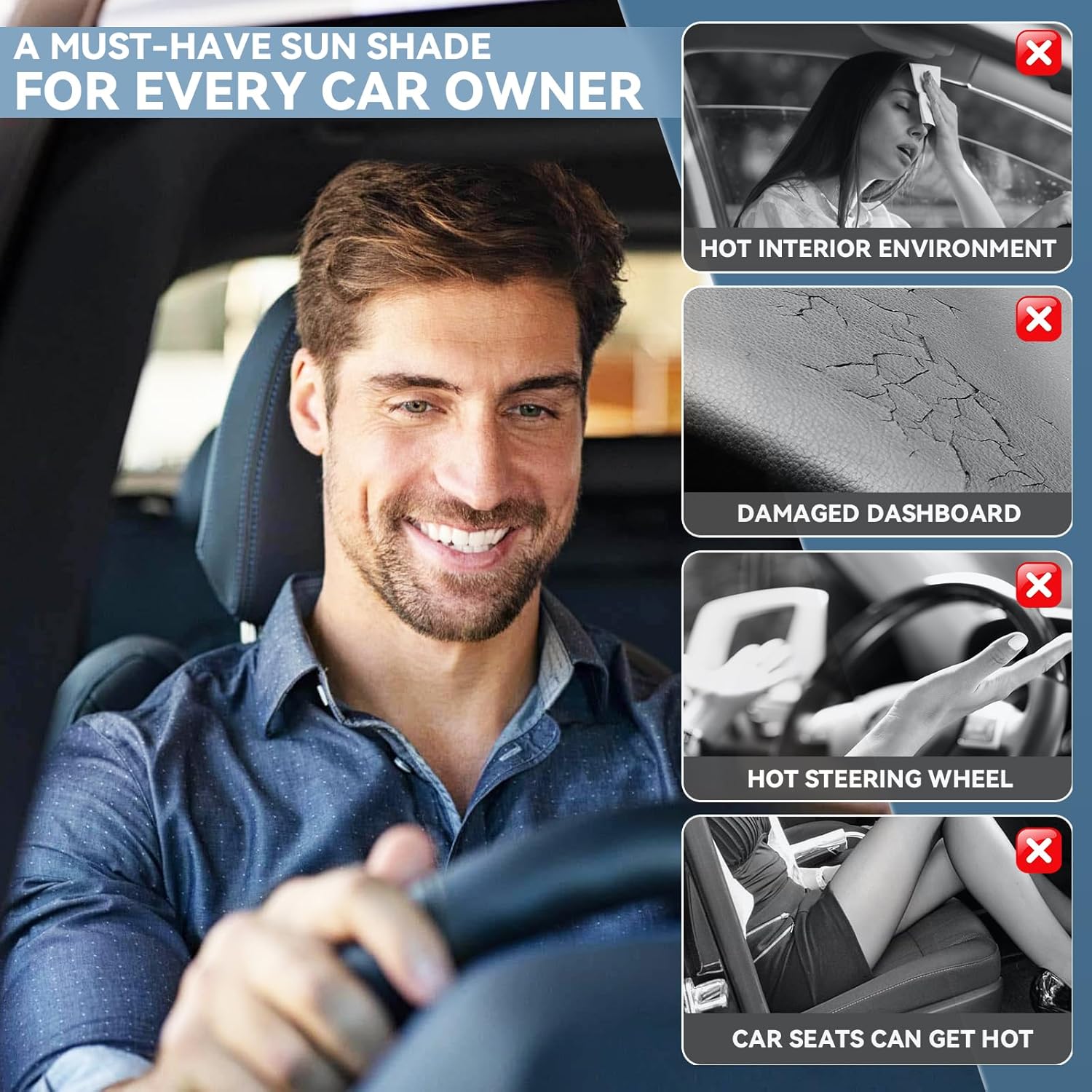- 【The latest upgrade】The windshield sun shade is made of 240T fabric with a thicker density, Nano coating, 4 anti-UV layers, and better reduce of the heat and UV rays.Double D-shaped steel ring design, So useful is the sunshade that allows you to enter the car easily.