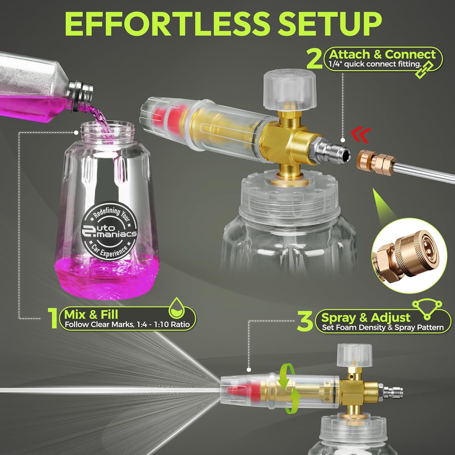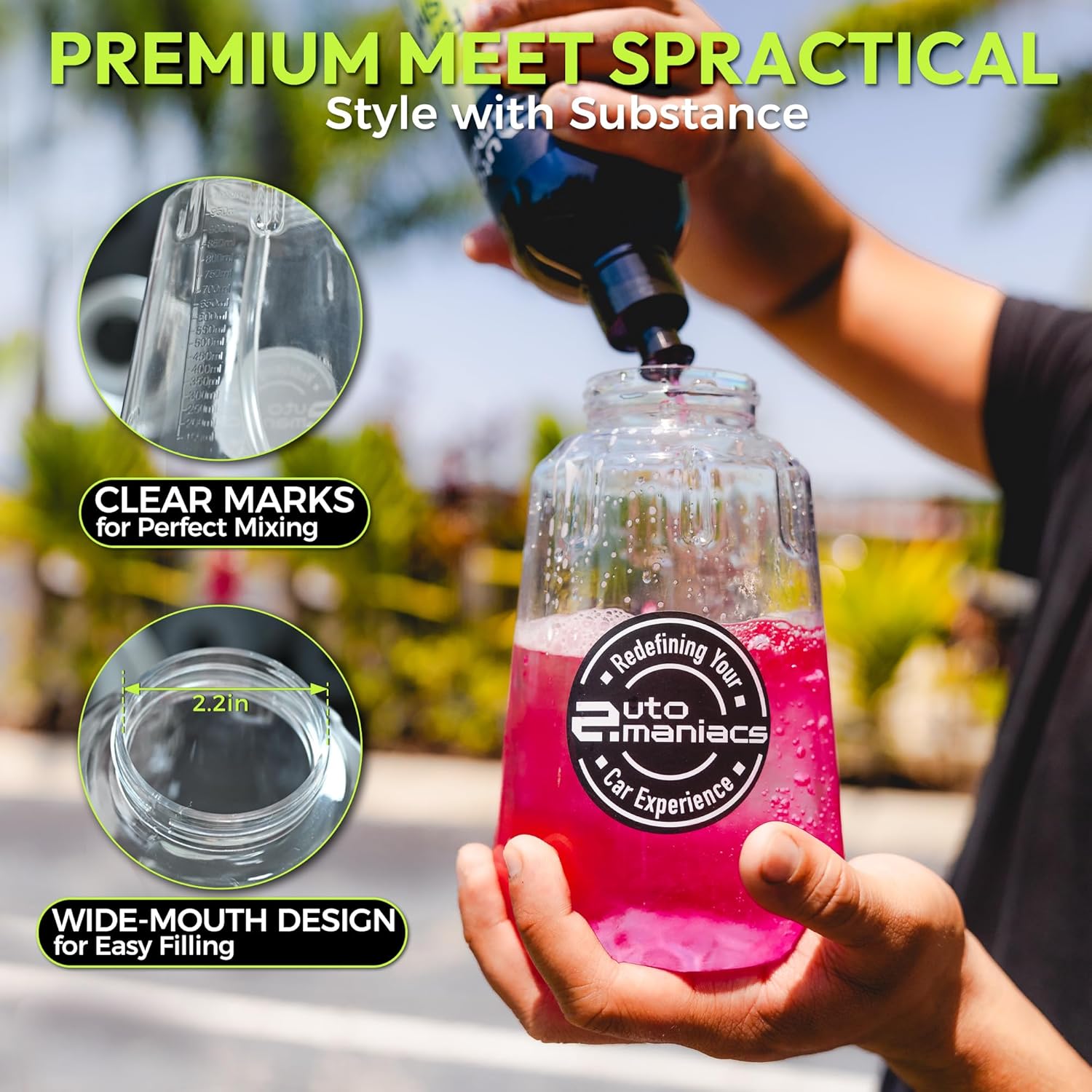 - ๐โจ ๐๐ถ๐ด๐ต-๐ฃ๐ฟ๐ฒ๐๐๐๐ฟ๐ฒ & ๐จ๐ป๐ถ๐๐ฒ๐ฟ๐๐ฎ๐น ๐๐ถ๐--REQUIRES pressure washer (Not Garden Hose). The 1/4" Quick Connector works with all major pressure washer brands, while the wide-mouth design makes refilling car soap a breeze. Leak-proof seals keep your workspace tidy, and the transparent bottle with measurement lines ensures perfect soap ratios โ whether you're using a car wash foam cannon for the first time or are a seasoned detailer.