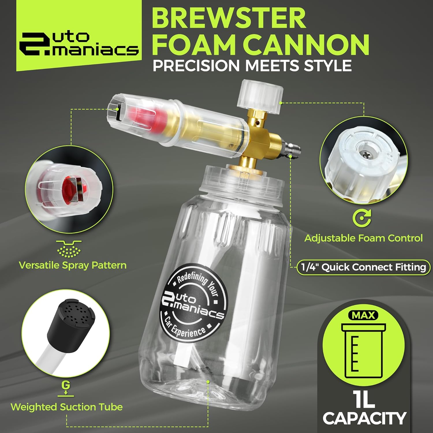 AutoManiacs Foam Cannon for Pressure Washer, Adjustable Car Wash Sprayer with 1/4 Inch Quick Connector, 1L Durable Snow Foam Blaster for Car & Truck Washing