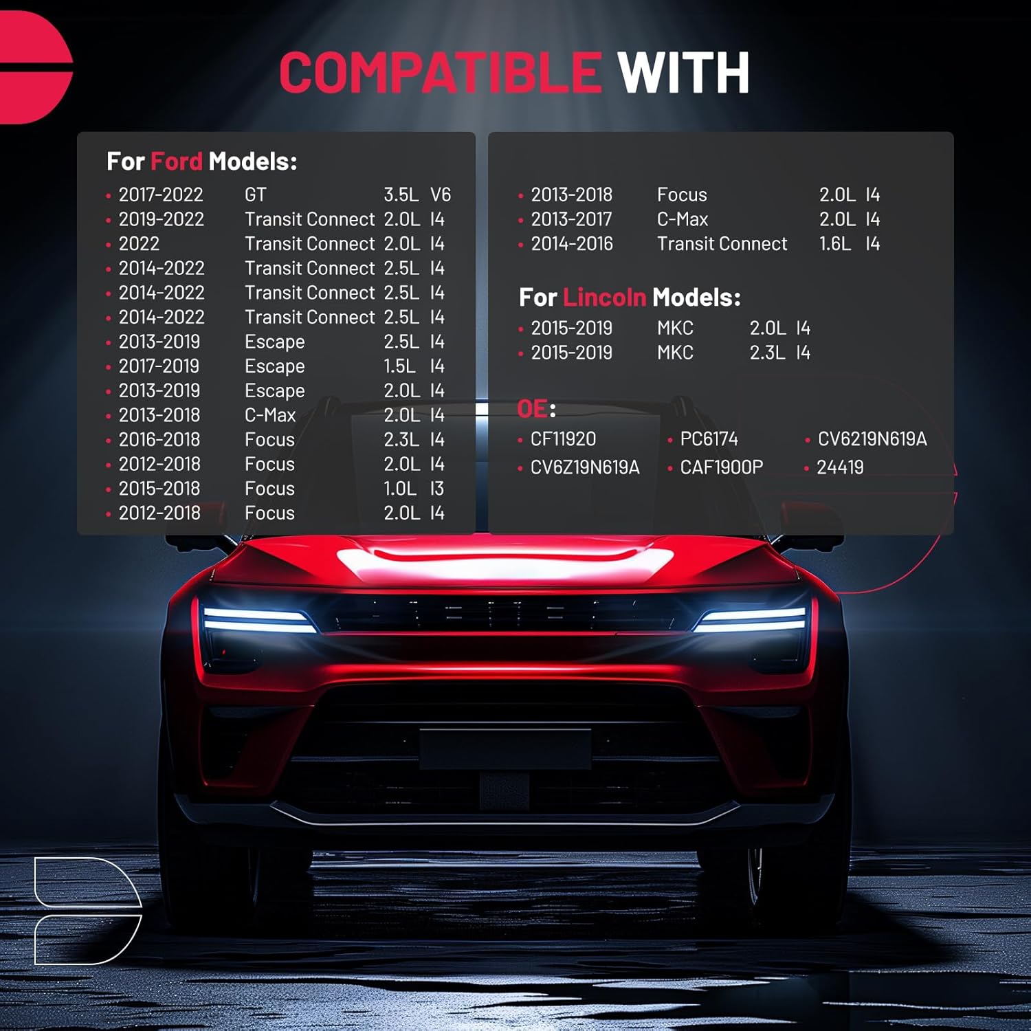 - [Vehicle Fitment] Compatible with Ford GT 2017-2022 3.5L V6, Transit Connect 2019-2022 2.0L l4, Transit Connect 2014-2022 2.5L l4, Transit Connect 2014-2016 1.6L l4, Escape 2013-2019 2.0L/2.5L l4, Escape 2017-2019 1.5L l4, C-Max 2013-2018 2.0L l4, Focus 2016-2018 2.3L l4, Focus 2012-2018 2.0L l4, Focus 2015-2018 1.0L l3; Compatible with Lincoln MKC 2015-2019 2.0L/2.3L l4