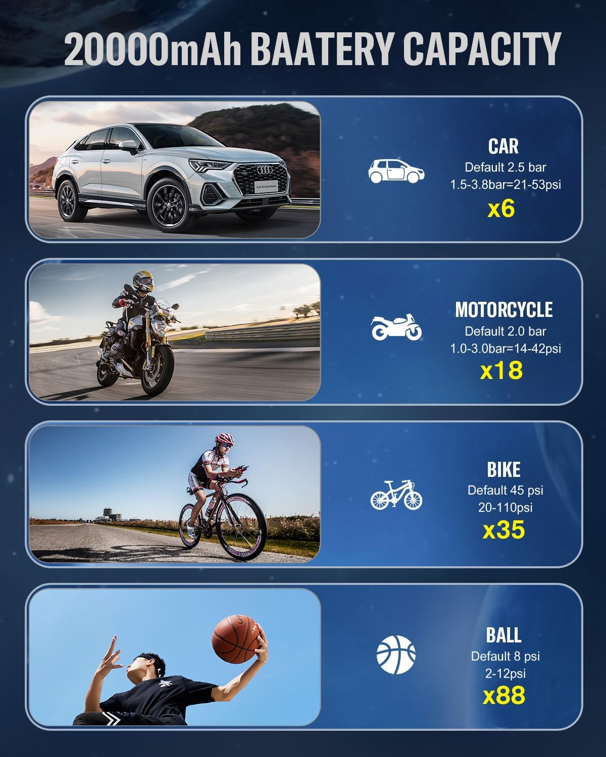 - Air Pump for Car Tires:equipped with a built-in pressure gauge and a LCD screen,It automatically stops when the desired tire pressure is reached,preventing over-inflation and ensuring optimal tire performance and safety