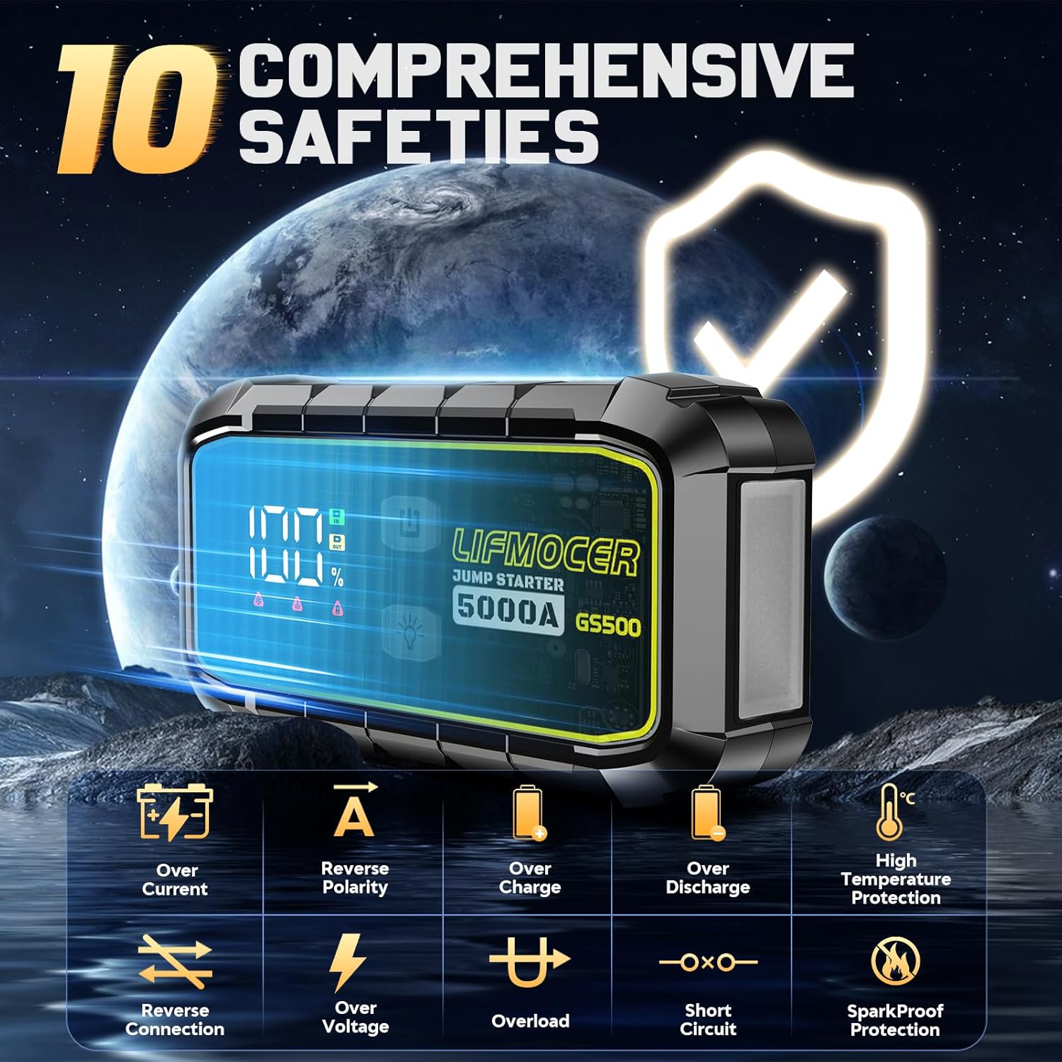 - 【Intelligent Secure Protection Design】Our battery jump starter built-in 10 types of protection, frees your worries of misuse and sparks. it comes with excellent conductivity and heavy-duty jump cables. We wanted to ensure our users feel 100% safe using our product