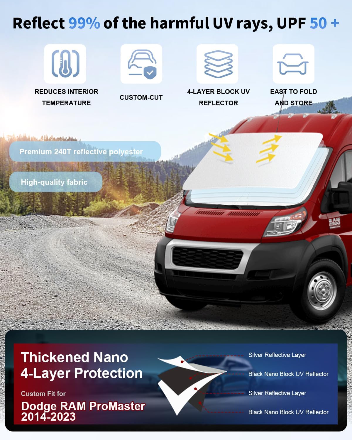 - [VEHICLE SPECIFIC] SLOGENTO Windshield Shade custom fit for 2014-2023 2024 2025 2026 Dodge Ram ProMaster Accessories ,Full covered your windshield,No Gap,100% Perfect fit.