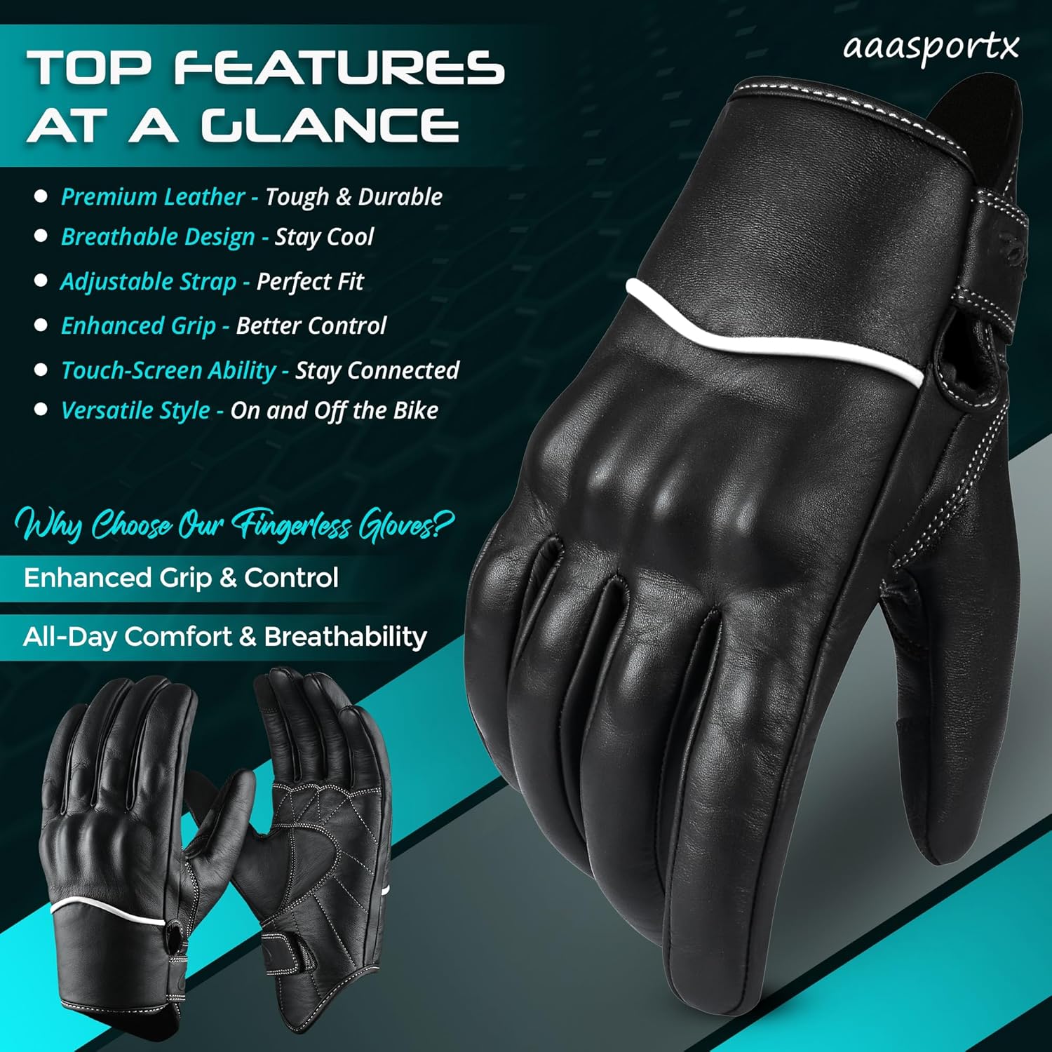 - LEATHER MOTORCYCLE GLOVES - aaasportx black and white Motorcycle Gloves are made of premium quality Genuine Leather. Our Lightweight Motorcycle Gloves ensures durability through a variety of situations. aaasportx Motorcycle Gloves for Men offer a high-quality, stylish, and durable finish that excludes sophistication and toughness on the road.