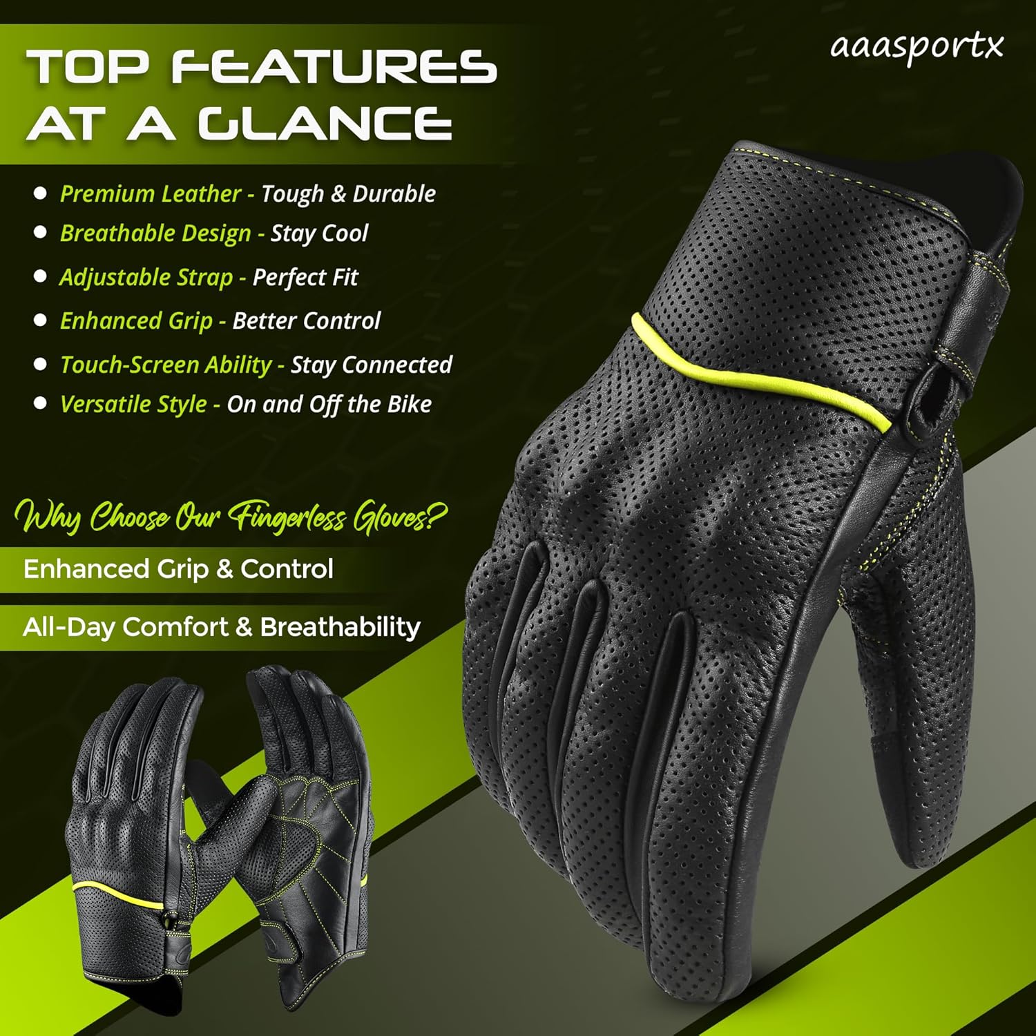 - LEATHER MOTORCYCLE GLOVES - aaasportx black and yellow perforated Motorcycle Gloves are made of premium quality Genuine Leather. Our Lightweight Motorcycle Gloves ensures durability through a variety of situations. aaasportx Motorcycle Gloves for Men offer a high-quality, stylish, and durable finish that excludes sophistication and toughness on the road.