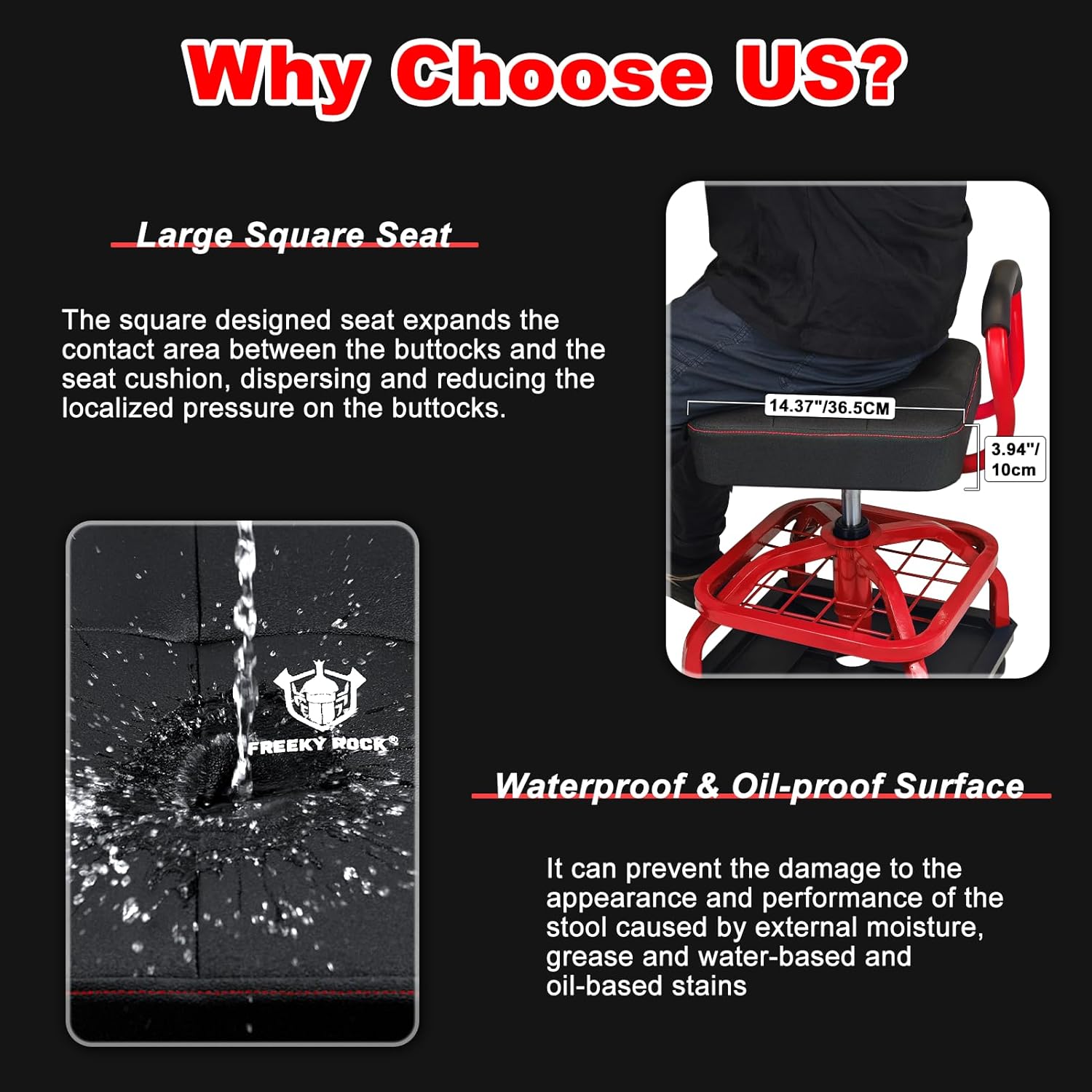 - 【Thickened Seat Cushion】14.37"/36.5CM Diameter Seat. 3.94"/10 CM height cushion. The thickened memory foam padded cushion seat is larger than other garage work stools. The cushion surface of stool is made of PVC material which is waterproof and oilproof, making it easy to be cleaned.