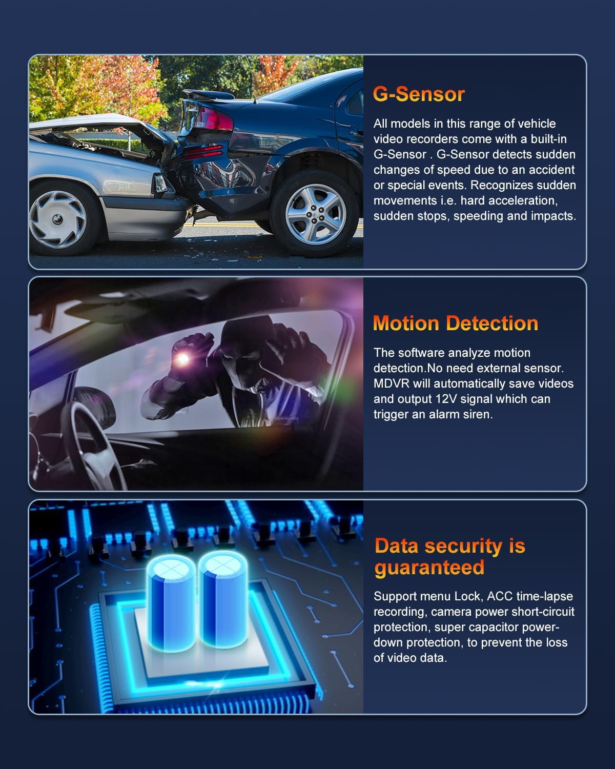 - Multifunctional MDVR: ① Delay Recording: Set the MDVR to continue recording for up to 12 hours after the vehicle is turned off, powered by the battery. ② G-Sensor: Internal G-sensor for analyzing the vehicle's movement state, helping you understand the driving conditions. ③ Alarm Output: Automatically displays images from the reverse, left turn, or right turn channels when reversing, turning left, or turning right (requires I/O cables to be connected).