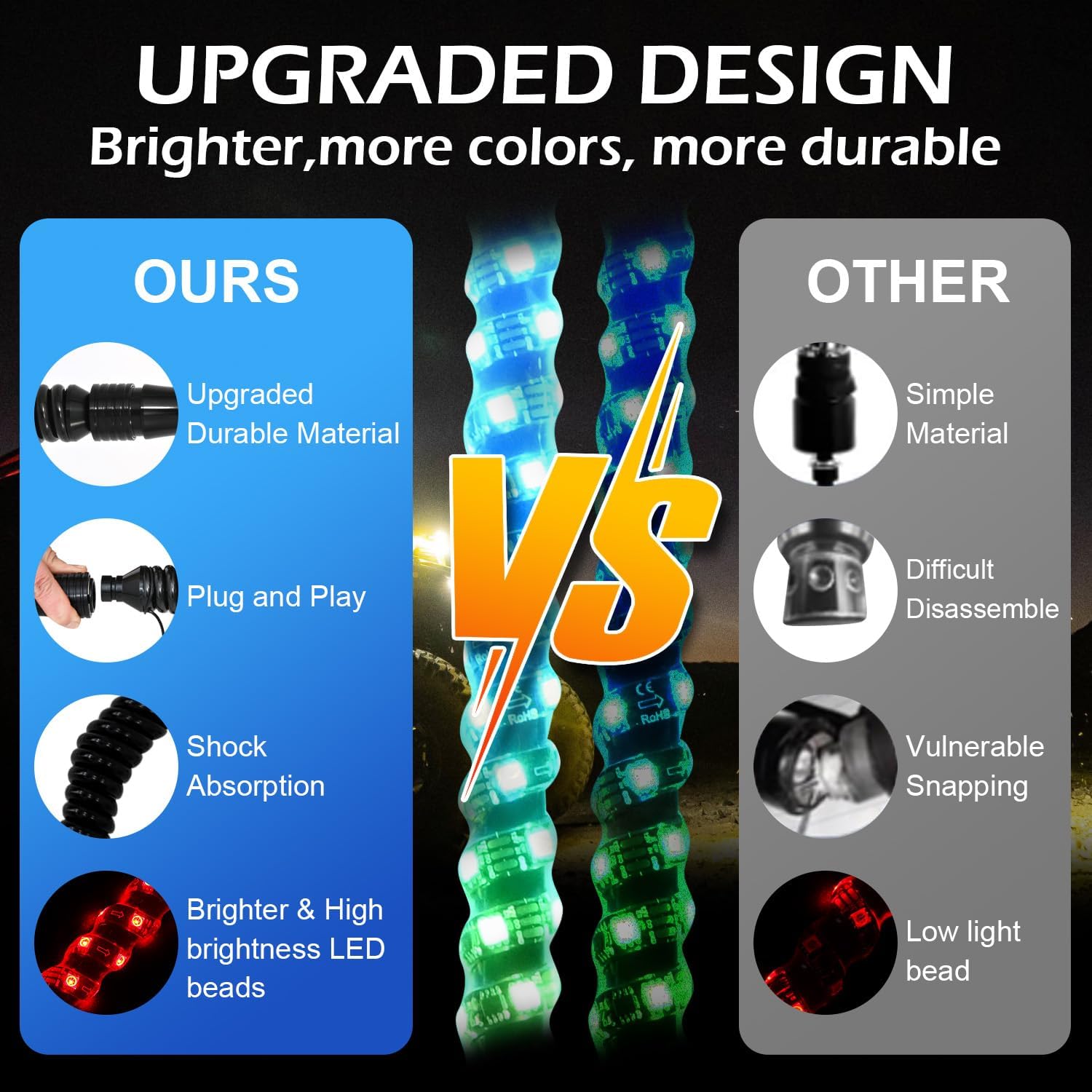 - 【UPGRADED High brightness LED beads】: Whip Lights using the latest 5050 RGB LED chips. These LED Fat Whip Lights are three times brighter and more visible, even in daylight. Whip lights with hundreds of colors, dancing patterns, and adjustable brightness and speed settings. The tightly coiled lighted whip design ensures a 360°glow, delivering brighter, more uniform lighting. Ensure your safety on the night trail and always stand out during the ride