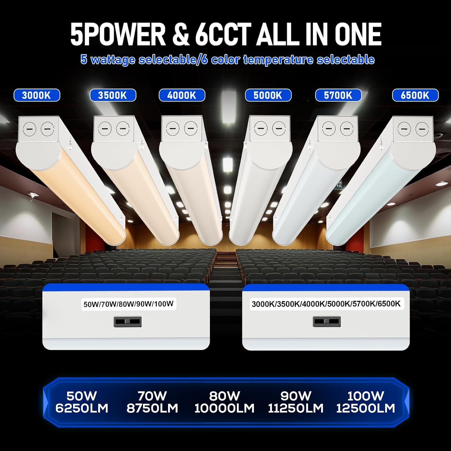 - [6CCT All in One] Our 8ft Low-Bay Luminaires for Commercial and Industrial Buildings light fixture comes with an adjustable color switch that you can manually adjust between 6CCT 3000K 3500K 4000K 5000K 5700K 6500K. With only 1 bulb, you can choose between 6 color temperatures, no need to try traditional single-color tube bulbs, you can choose the color of light you want according to different space needs