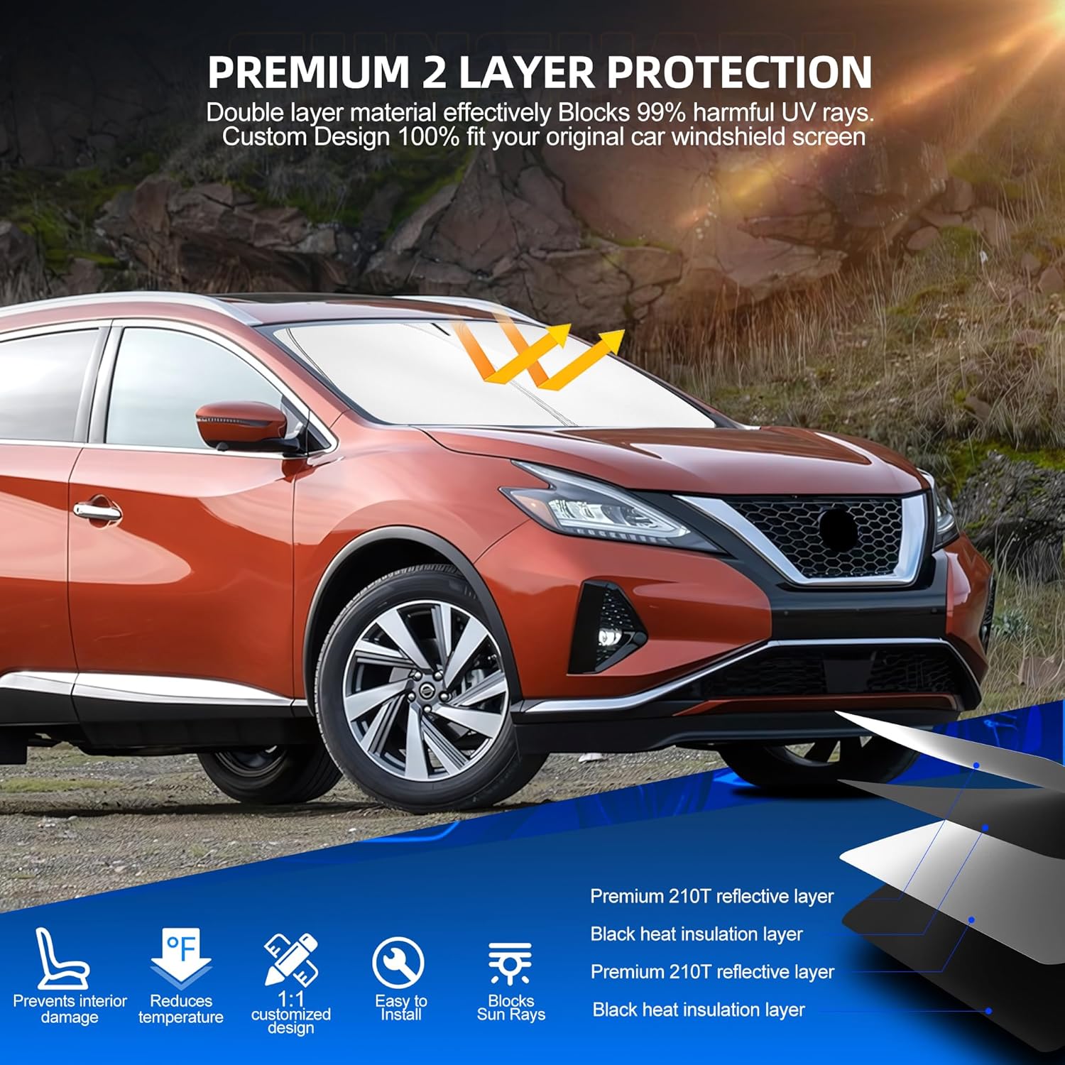 - 𝐂𝐮𝐬𝐭𝐨𝐦 𝐅𝐢𝐭 𝐟𝐨𝐫 𝐘𝐨𝐮𝐫 𝐕𝐞𝐡𝐢𝐜𝐥𝐞: Sulagi sun shade is custom-designed for Ni-ss-an Murano 2015-2024, ensuring a perfect fit without any gaps. This sunshade fully covers your windshield, providing 100% coverage and maximum protection for your vehicle. Please check vehicle model and year before purchasing