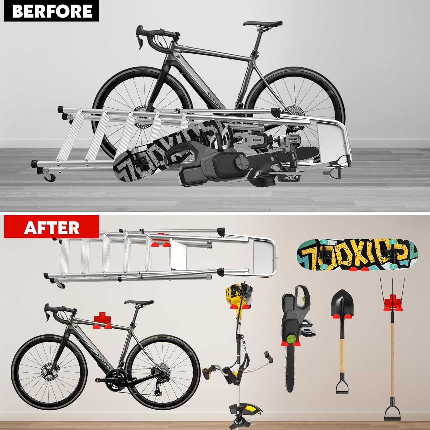 - Space Saving: This product easily hold your trimmer neatly and securely. Keeping it off the ground and easily accessible when you need it.Garage organizers and storage allows you to free up valuable space in your garage, shed, home or enclosed trailer,saving you time and space.