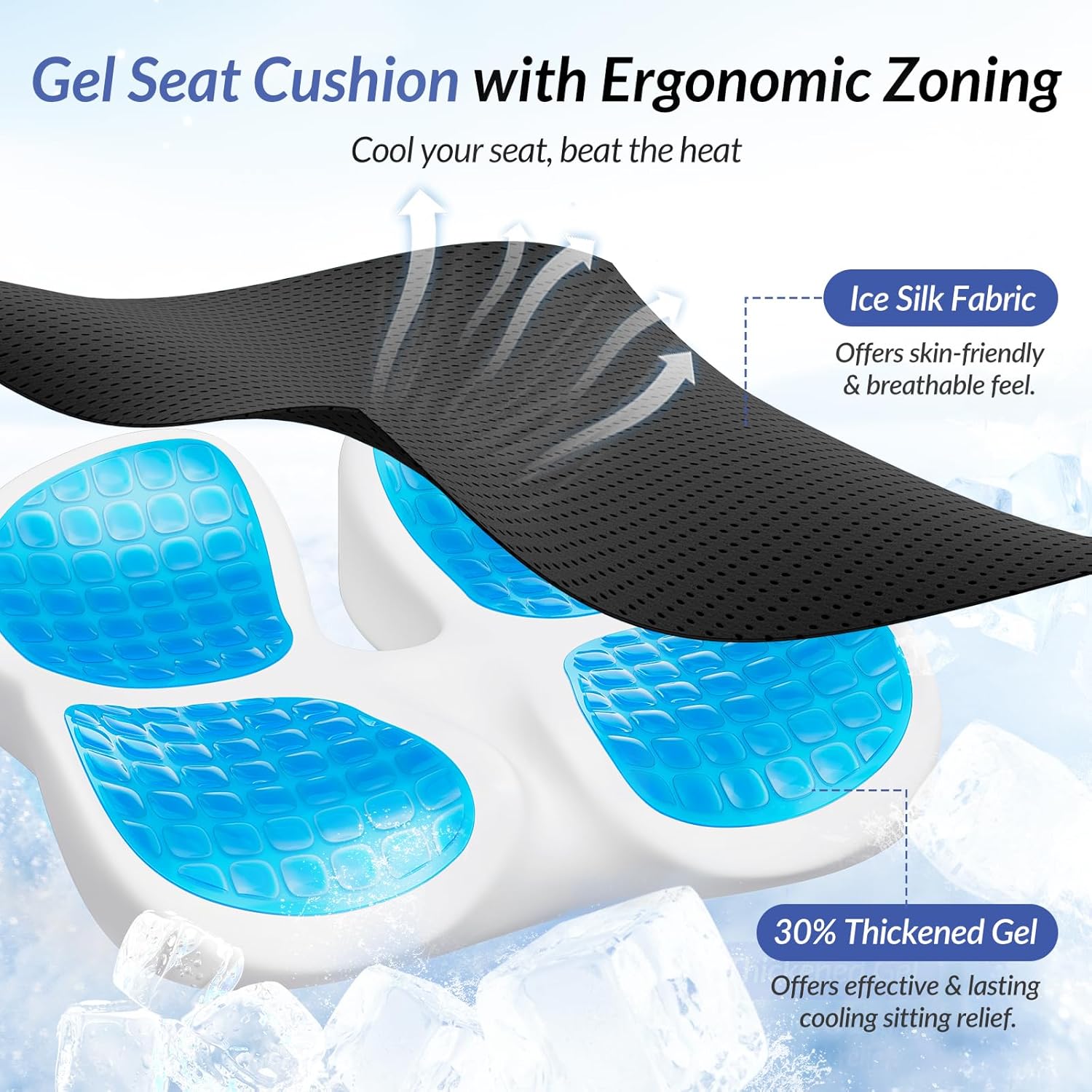 - Ergonomic Zoning for All-Around Relief: This gel seat cushion features ergonomic zoning for all-around relief. At the front, there is an intimate groove for ventilation and health in intimate areas. Meanwhile, the thigh slope designs help reduce thigh pressure and improve posture. In the back, the U-shaped cutout relieves pressure on tailbone. Plus, the ergonomically curved hip support zones contour to your butt, distributing weight evenly and relieving hips discomfort. These 4 designs work together to provide 4-dimensional comfort and support for prolonged sitting