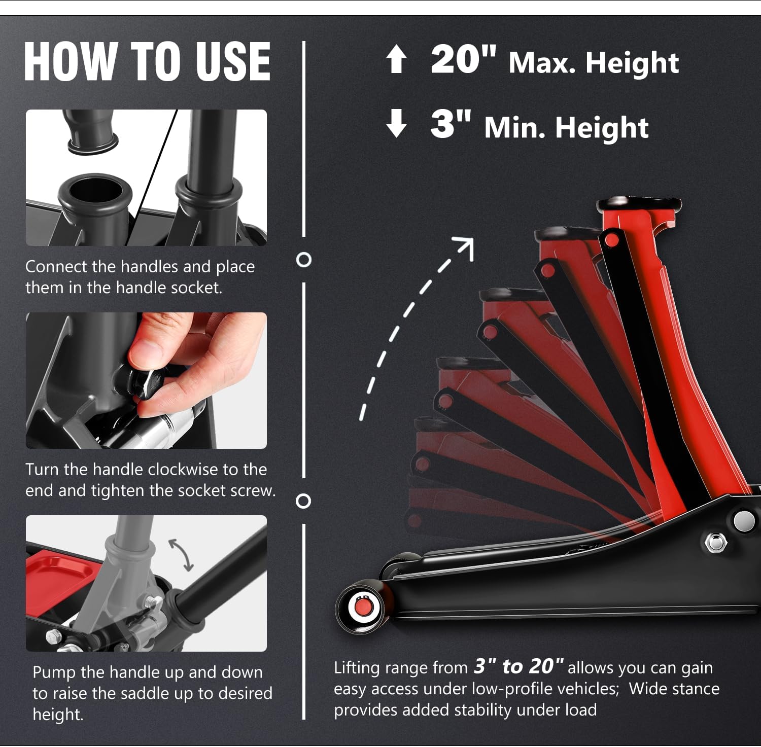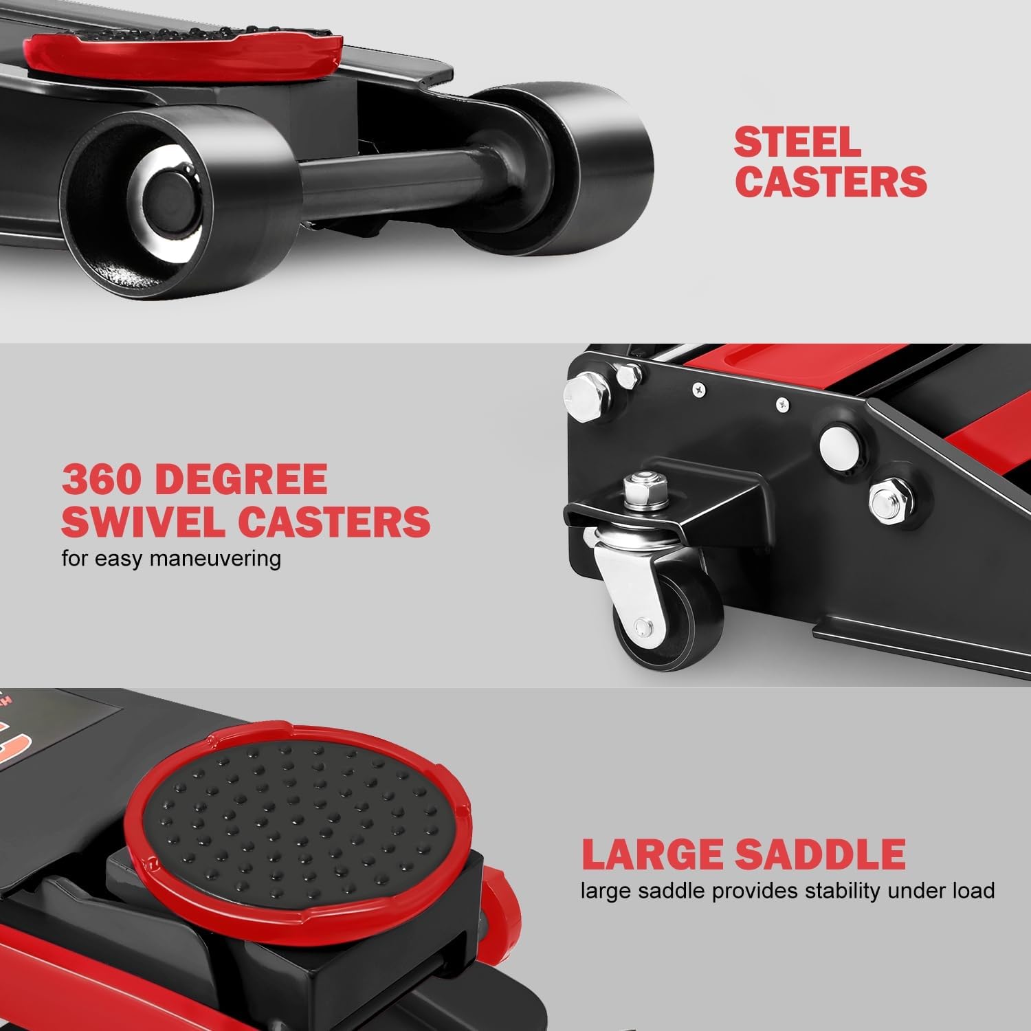- OVERLOAD PROTECTION & EASY JACK POSITIONING - Built-in dependable safety release valve triggers in the event of an overload to prevent damage or injury. The large saddle equipped with rubber pad provides extra stability and helps protect your vehicle.