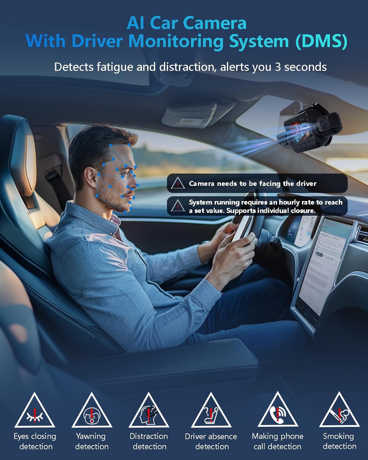 - 【AI Dash Camera with DMS】The V8Pro is AI Dash Cam with Driver Monitoring System, fatigue driving detection is an advanced AI in-vehicle safety technology that is primarily used to monitor driver behavior and status. The main functions include, distracted driving detection, yawning detection, driver absence detection, making phone call detection, and smoking detection. These features help to improve driving safety and comfort. Running the system requires the hourly speed to reach the set value