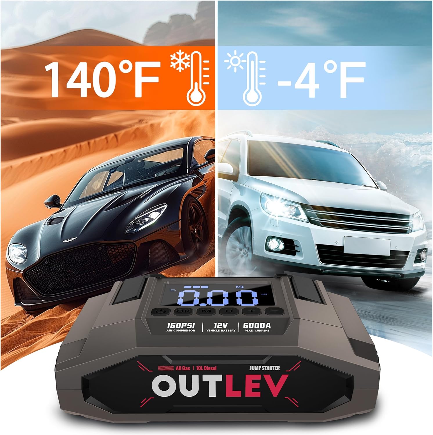 - ADVANCED SAFETY & DURABLE DESIGN (10-LAYER PROTECTION): Jump starter with total confidence. OUTLEV safeguards prevent sparking, reverse polarity, over-current, over-voltage, short-circuit and more. Heavy-duty smart clamps and honeycomb thermal management reduce heat by 30%, extending lifespan and ensuring safety.