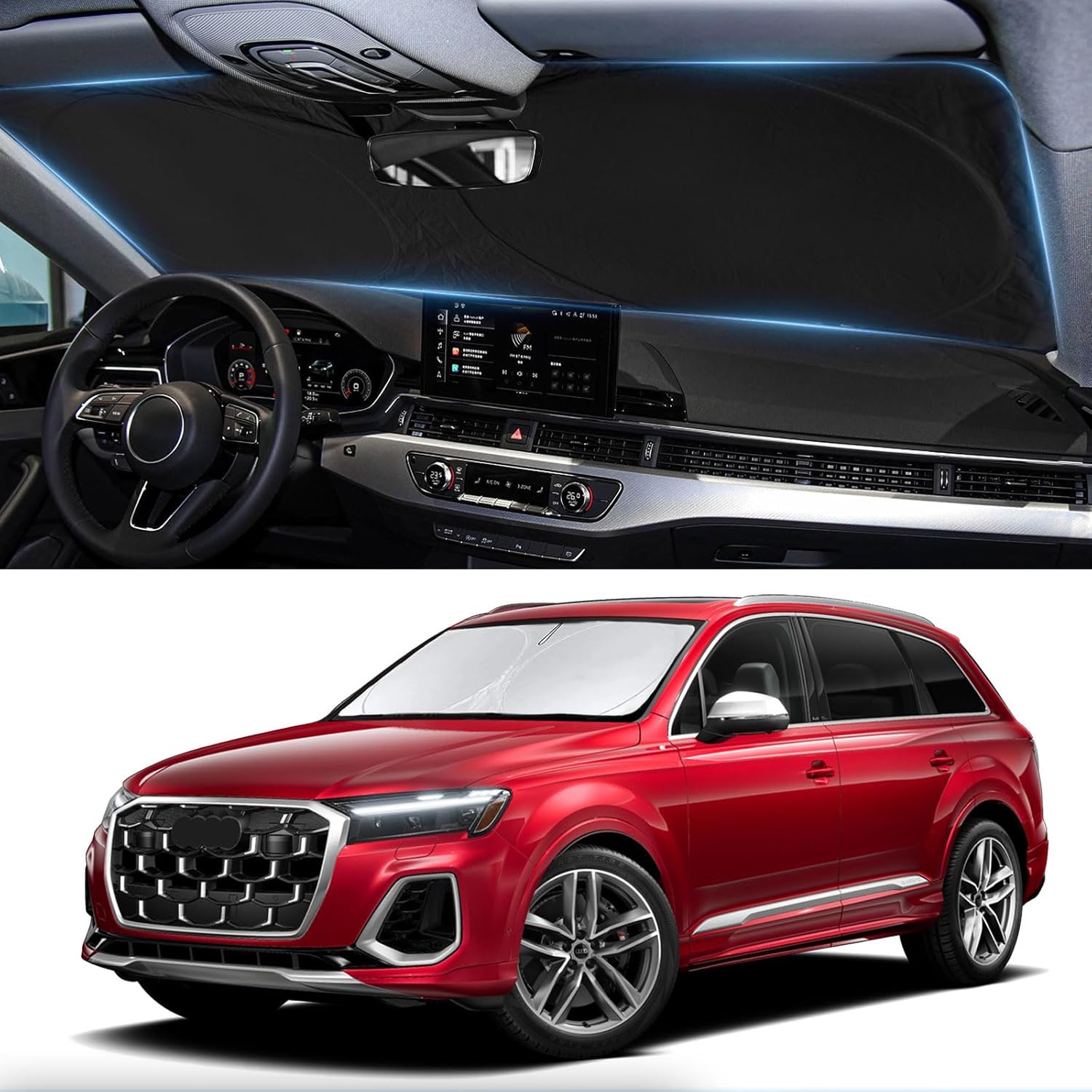 - [CUSTOM-FIT FRONT WINDSHIELD SUNSHADE] Automotive windshield sun shade is Specifically designed,which for 2016-2023 2024 2025 2026 Audi Q7 SUV accessories. We have several size of car sunshade. Please measure your car size and refer to our size before your purchase. Once installed it won't have gaps, sags or slumps like other car sun shade windshield