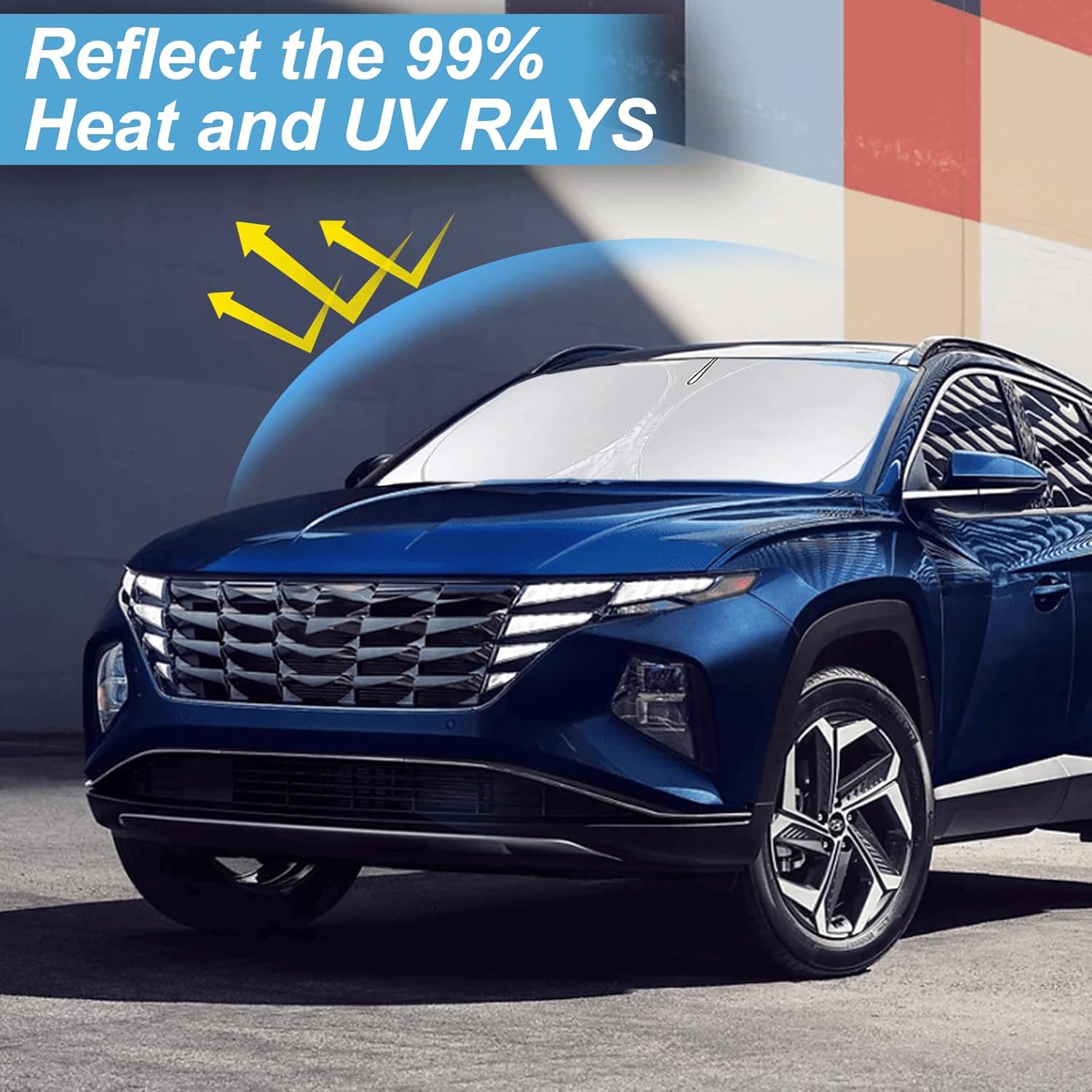 - [CUSTOM-FIT FRONT WINDSHIELD SUNSHADE] Automotive windshield sun shade is Specifically designed,which for Hyundai Tucson 2022-2026 accessories. We have several size of car sunshade. Please measure your car size and refer to our size before your purchase. Once installed it won't have gaps, sags or slumps like other car sun shade windshield