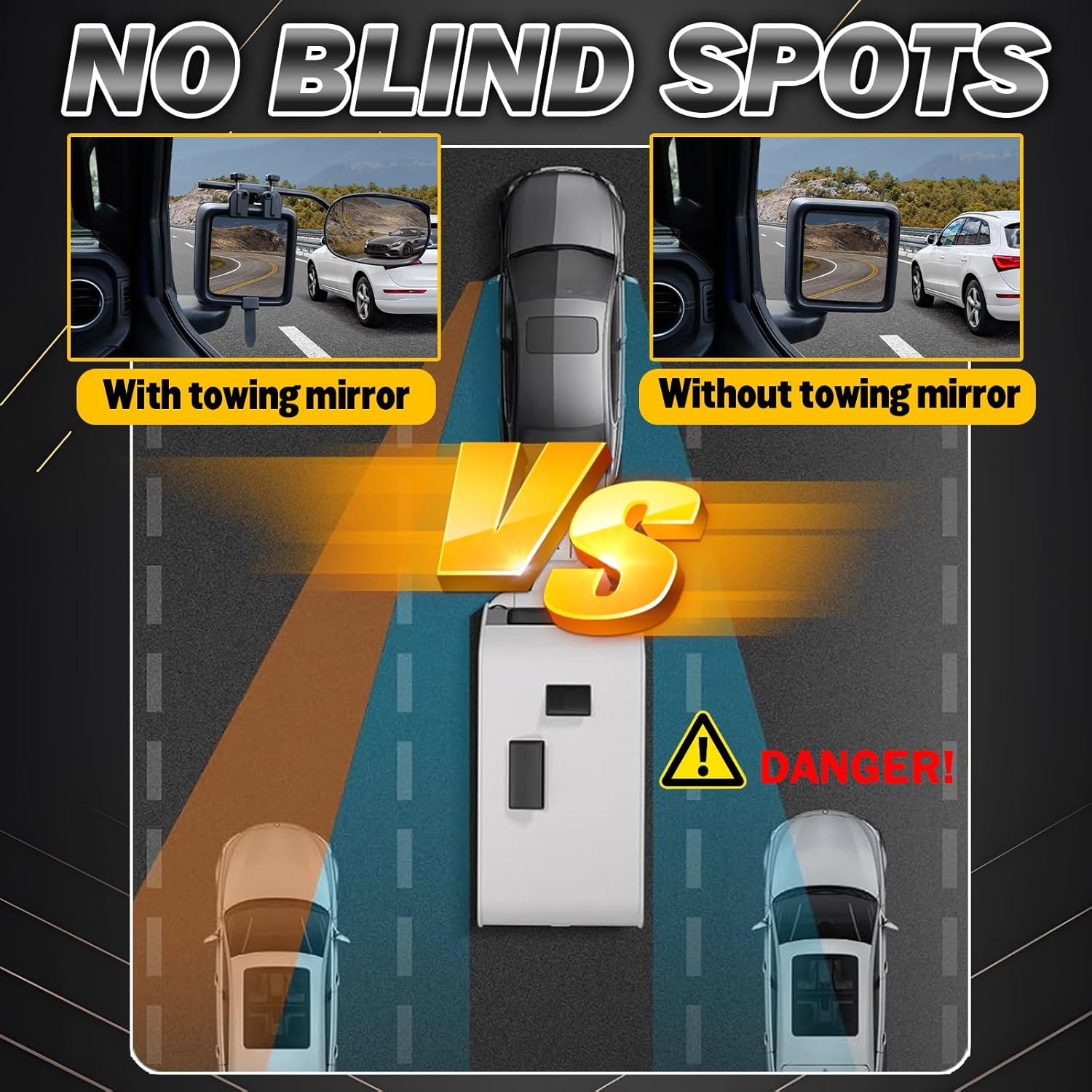 - 【UNIVERSAL FIT】Designed to be compatible with a wide range of large vehicles, including SUVs, trailers, RVs, trucks, and more, our towing mirrors offer unparalleled versatility. Enjoy the convenience of mirrors that seamlessly adapt to your towing needs.