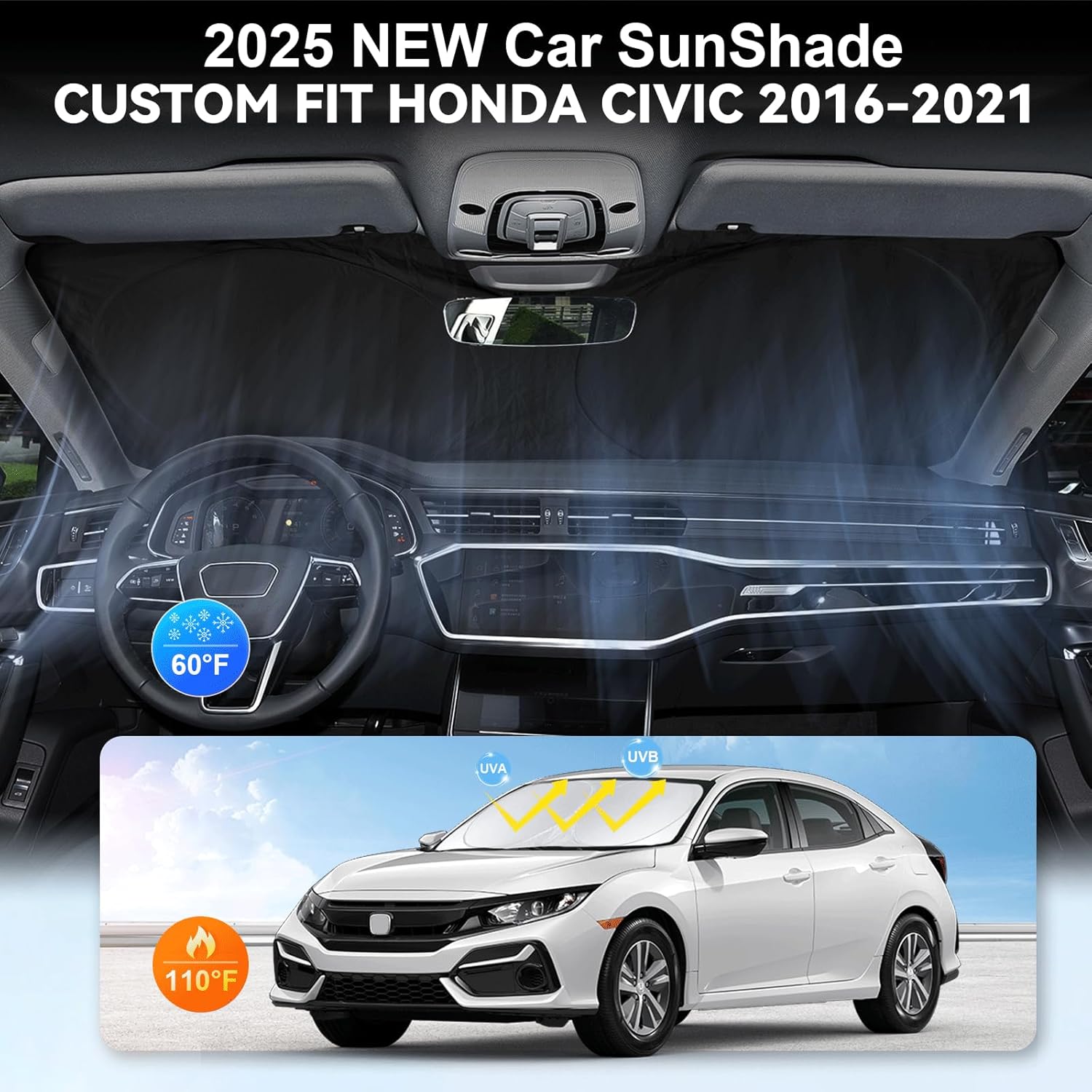 - [CUSTOM-FIT FRONT WINDSHIELD SUNSHADE] Automotive windshield sun shade is Specifically designed,which for 2016-2021 Honda Civic accessories. We have several size of car sunshade. Please measure your car size and refer to our size before your purchase. Once installed it won't have gaps, sags or slumps like other car sun shade windshield