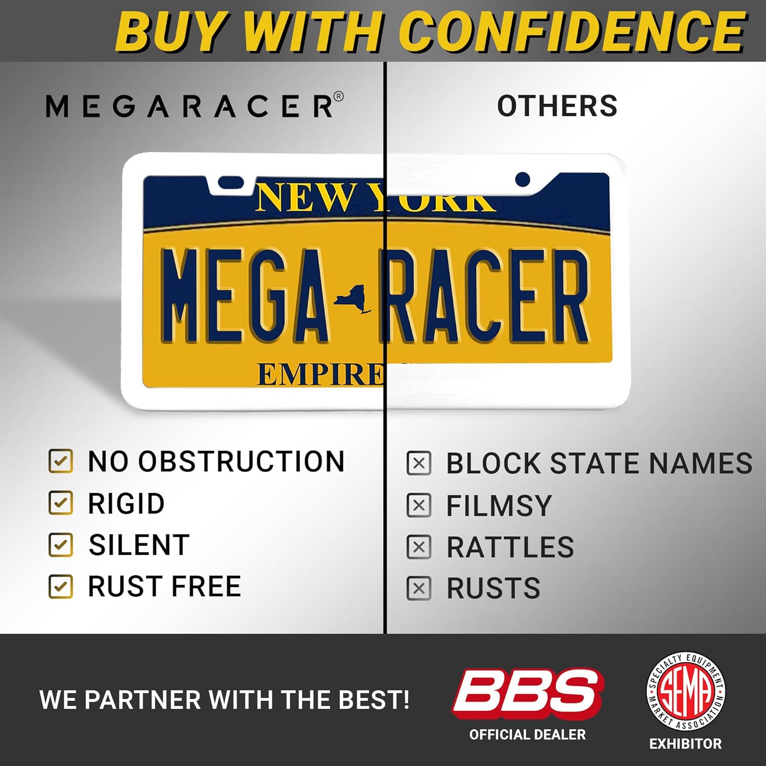 - STRONG DURABLE QUALITY: Our 1 pc License Plate Frame White Holder is made strong to uphold anything from car washes to weather changes. Mega Racer's white license plate frames are RATTLE PROOF and RUST RESISTANT keeping your vehicle paint SCRATCH FREE.