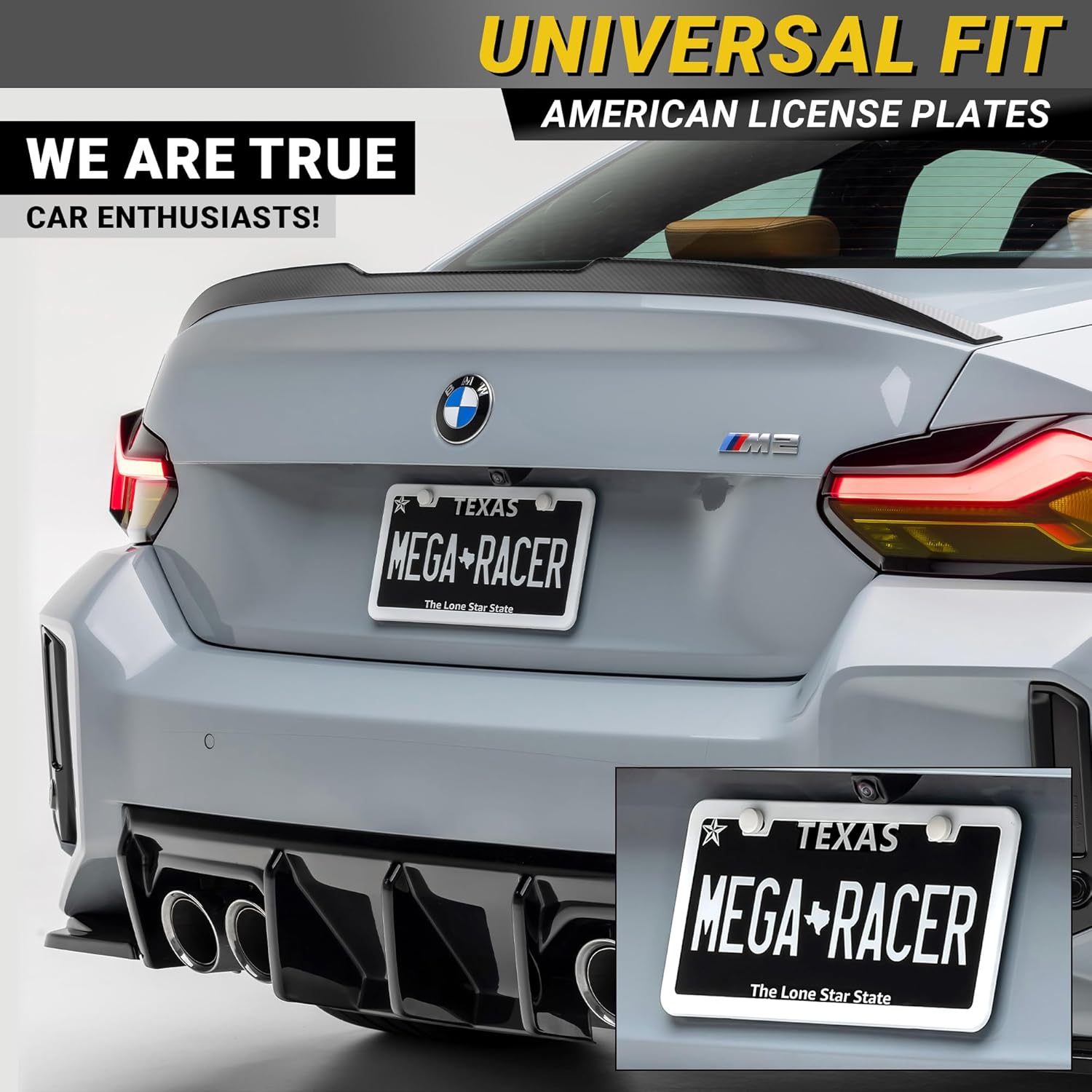 - CUSTOMER SERVICE: Mega Racer's 1 pc White License Plate Frame automotive accessories will leave both you and your ride satisfied. If you have any questions please send us a message via Amazon Message and we will be sure to respond within 24 hours.
