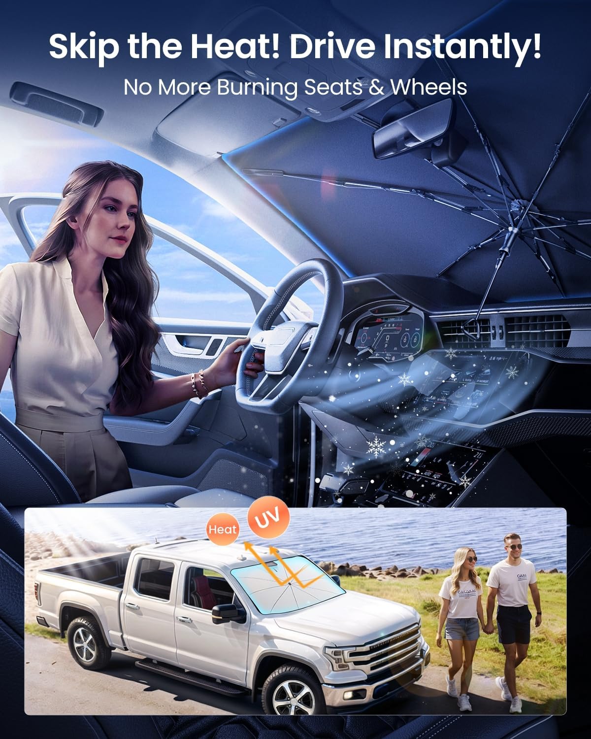 REEVAA 2025 Upgraded Truck Windshield Sun Shade Umbrella [100% Sun Protection & Keep Cool] Protect Interior, 360° Flex Handle Sun Shield Sunshade, X-Large (61''x40'') for Full-Size Trcuk/MPV Car