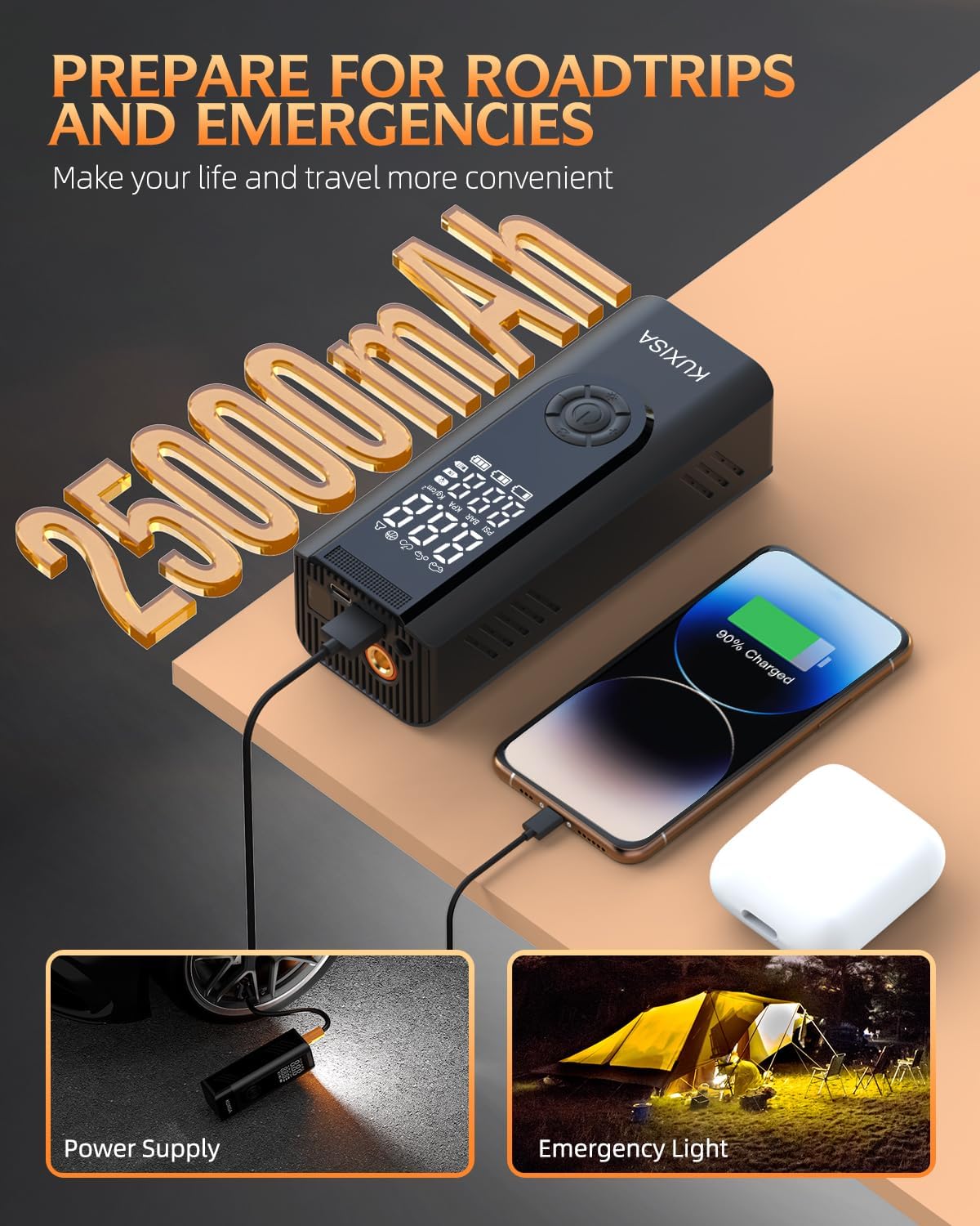 - 【Multifunctional Integration】It serves as an excellent option for inflating car, motorcycle, and bicycle tires, as well as balls and other inflatable items, boasting a range of practical functions.It is not only a portable tire inflator and air compressor, but also functions as your emergency power supply. It is equipped with high-brightness LED lights to illuminate your way during nighttime travel