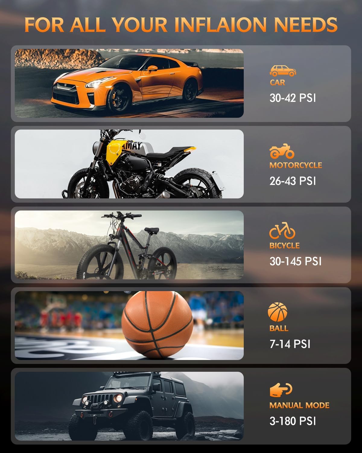 - 【4+N Intelligent Modes】Featuring a dual display screen, this device allows for easy reading of both the preset tire pressure value and the real-time pressure. It offers 4 preset inflation modes: bicycle, motorcycle, car, and ball. Additionally, the manual mode enables you to set the pressure value (ranging from 3 to 180psi) based on the object being inflated. Our portable air compressor caters to all your inflation requirements