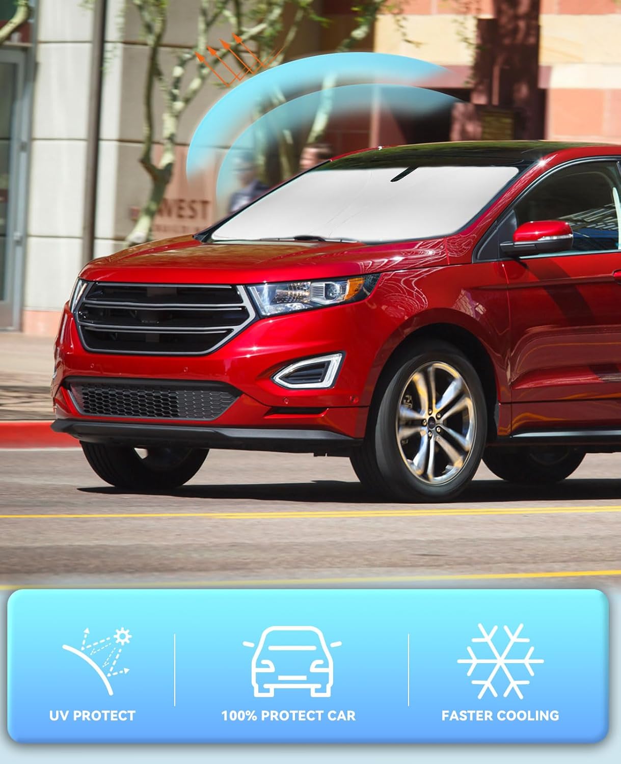 - 【Vehicle Specific】Our Windshield Shade Cover custom fit for 2007-2013 2014 Ford Edge Accessories , Base, Sport, Hybrid, A-Spec SUV Accessories,Full covered your windshield,No Gap,100% Perfect fit. The precise fit design and reinforced steel ring are sufficient to allow the sun shade to precisely fit the front window without the need for suction cups to hold it in place, effectively protecting your car from the sun's rays.