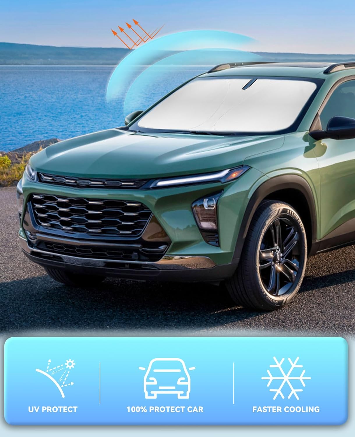 - 【Vehicle Specific】Our Windshield Shade Cover custom fit for 2013-2023 Chevrolet/Chevy Trax LS, LT, LTZ, Premier, SUV Accessories ,Full covered your windshield,No Gap,100% Perfect fit. The precise fit design and reinforced steel ring are sufficient to allow the sun shade to precisely fit the front window without the need for suction cups to hold it in place, effectively protecting your car from the sun's rays.