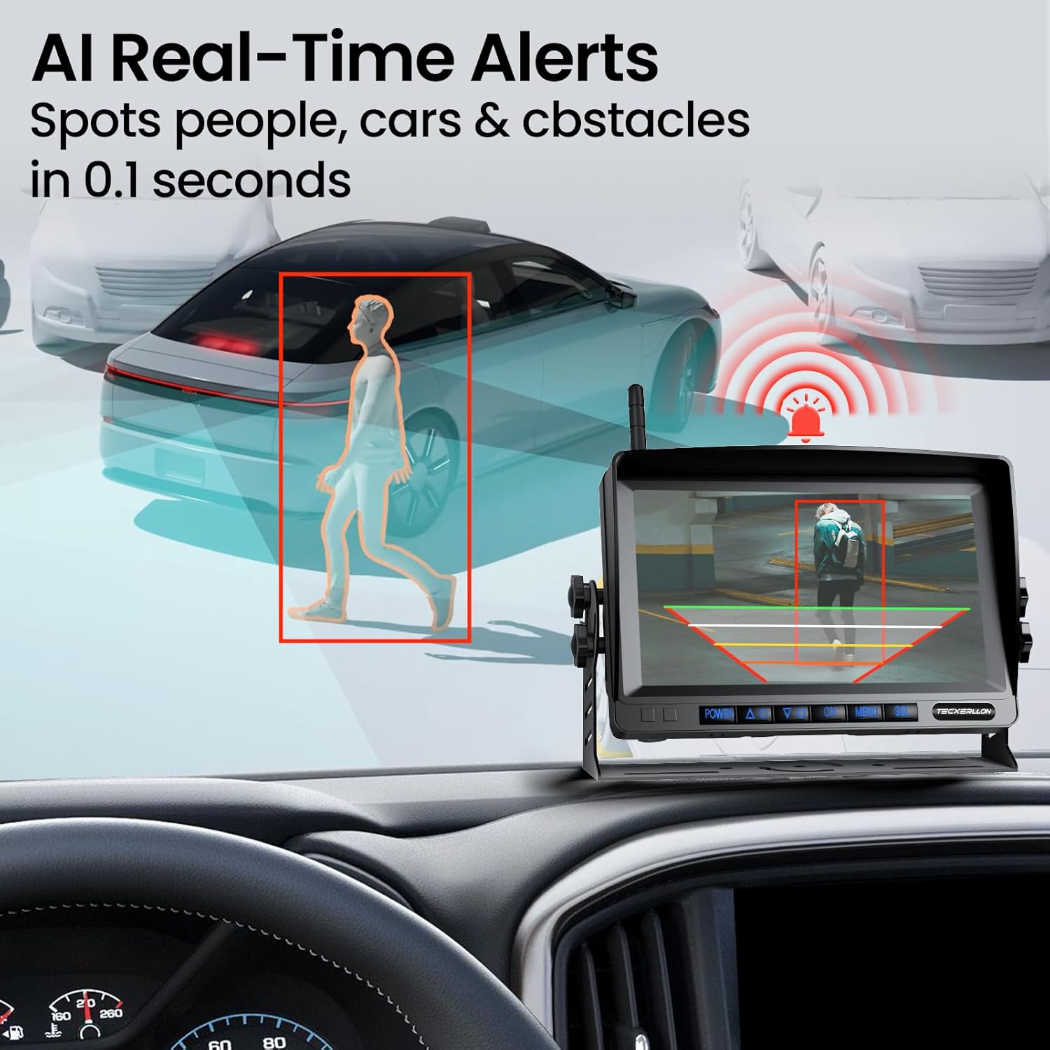 - SMART AND SAFE REVERSING WITH AI: Stay safe with our advanced AI-powered backup camera, which instantly detects pedestrians, vehicles, and obstacles. Receive real-time alerts to stay aware and in control, whether you're reversing or driving. Drive smarter, safer, and with confidence—every time.