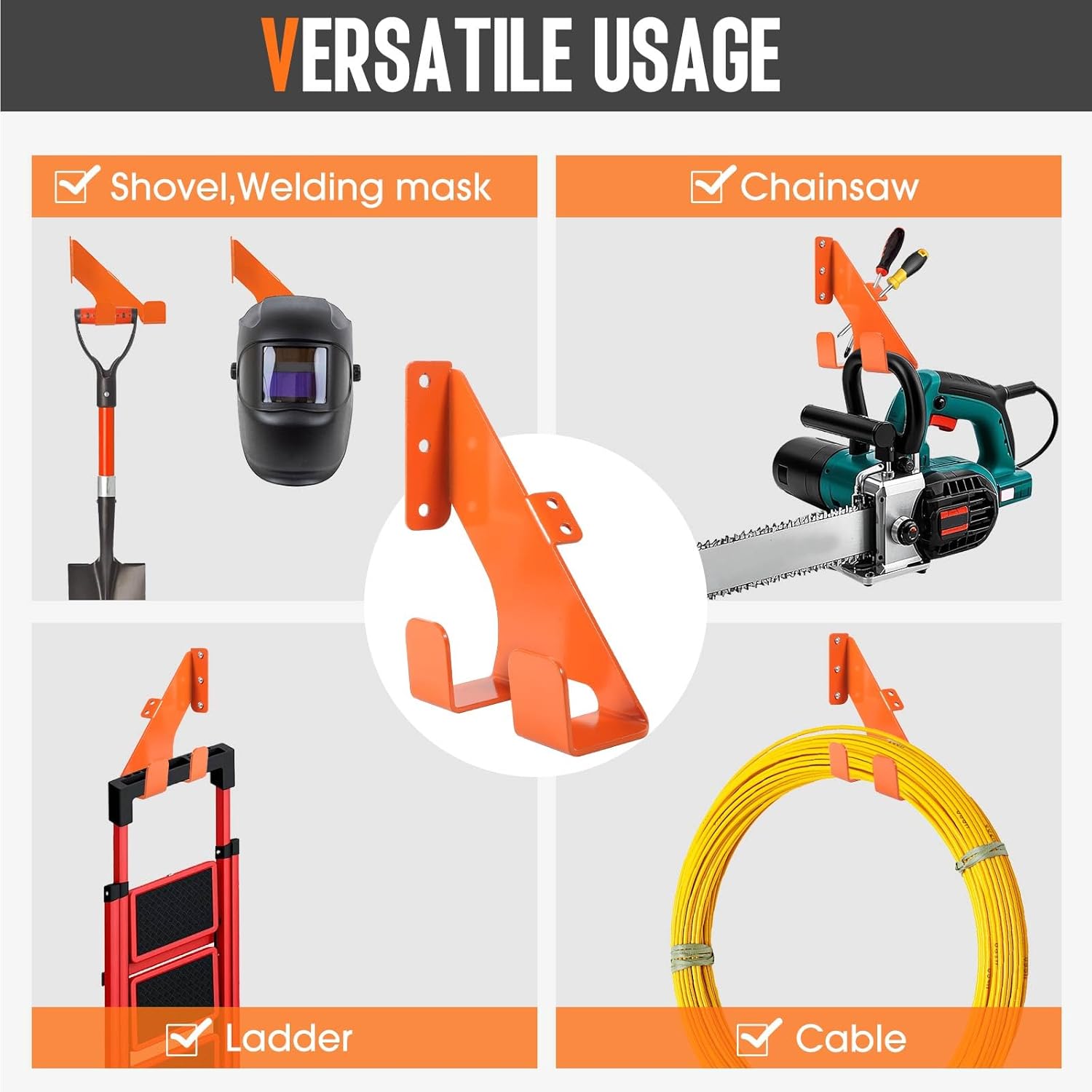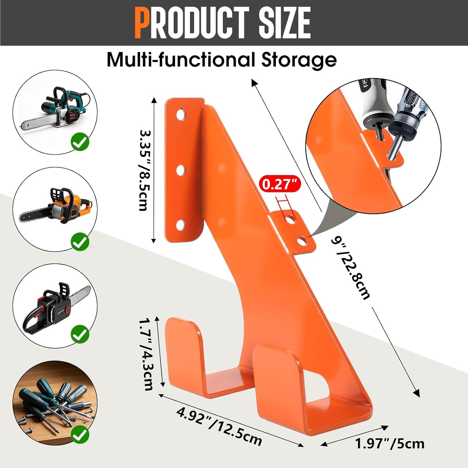 - HORIZONTAL OR VERTICAL: Unique design supports two ways to hang chain saws, the chain saw hook can hang the saw any way you want, two holes for chain saw wrenches and chain saw accessories, holds 99.99% of gas or electric chain saws, can also hang other tools, also suitable for shovels, rakes, brooms, mops, cables, hoses, ladders, etc.(Please check the size of the device first to ensure compatibility)
